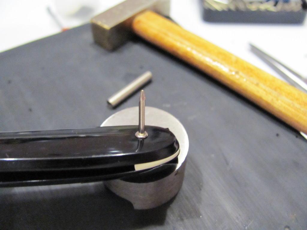 1. Заклеить изолентой РК, что бы не пораниться и случайно её не повредить. 2. Делаем 1 удар керном по центру пина, рекомендую пин немного сделать плоским, для удобства. 3. Сверлом 1.6 мм делаем отверстие глубиной 2 мм, потом сверлом 1.8 мм. Тут размер сверла зависит от толщины пина ( оси). 4. Высверлив пин, аккуратно снимаем верхнюю часть ручки, потом сняв фаску на пине , вынимаем вторую половинку ручки. Сборка ручки. 1. Заклеиваем изолентой место посадки пина ( т.к. ручка теперь отполирована, портить её не хотелось бы). 2. Одеваем шайбочку на пин (ось, гвоздик), аккуратно простукиваем трубочкой до упора в ручку. 3. Откусываем кусачками лишнее и зачищаем надфилем, зачищаем наждачной бумагой и полируем.