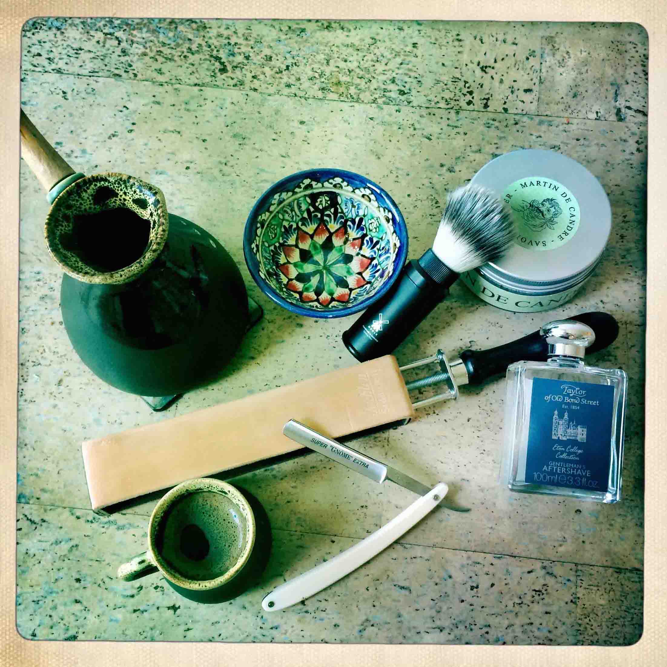 Сегодня утром: Бритва: Super Gnôme Extra du Grelot. Мыло: MdC fougère. Помазок: Mühle Silvertip Fibre de voyage. Ремень: Herold Solingen. Лосьон: TAYLOR ''ETON COLLEGE COLLECTION''. Чашка: Une céramique maroсaine. И конечно чашечка кофе