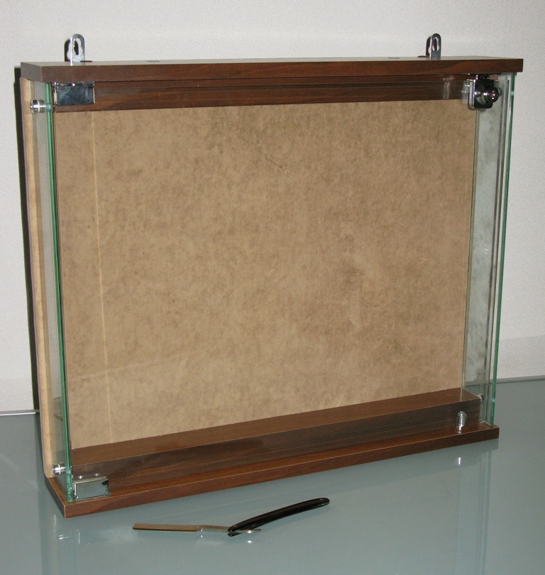По поводу стекла. Я категорически не согласен размещать потенциально опасные предметы в свободном доступе без стекла. У меня не просто стекло, а с замком. конечно не бог весть каким, но с барьером. Дети, гости, уборщица.. кто угодно может цапнуть и/или травмироваться. Я как бывший охотник привык оружие в сейфах хранить. В данном вопросе меня интересует только моё мнение Обратите внимание на большинство витрин. Они показывают только... ручки у бритв. Можно долго спорить о целостности восприятия, и что ручка она есть и бритва тоже. Мне фиолетово. Меня интересует металл а не пластик. Для меня важен только клинок. Все остальное как повезет. Я не согласен смотреть на ручки и не видеть саму бритву, а значит надо бритву полностью раскрывать. Два столбца в самый раз. отсюда ширина 50 см. Высота в 60 см взята из расчета разместить около 7-12 бритв по вертикали в каждом столбце. Чтобы хвостик не прятался в пластик, нужен угол между клинком и ручкой. Они предлагали мне подсветку сделать. Это могло быть решением проблемы влажности в витрине. Я правда отказался.