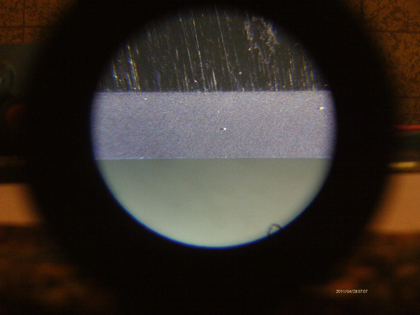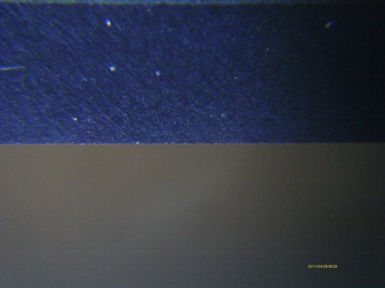 Приехал, наконец-то, ко мне один из заказанных китайских натуралов Yellow pulp stone. Ссылка, где покупал его, есть выше. Размер 200*50*24 мм. Гритность 2500-3000. Первое впечатление очень положительное, но камень специфический. Связующее в нем, чем то, напоминает спрессованную глину, да и цвет соответствующий грязно-желтый. Твердость камня, низкая, я бы даже сказал, что он немного рыхловат. Очень, очень легко образует суспензию, достаточно сделать 3-4 круга бритвой, а доводил его буквально пять минут. Кстати китайцы одну сторону типа вывели, убрали все самые крупные риски, так что осталось совсем немного над ним поработать. Инородных включений нет, только с торца, на нерабочей поверхности, попался один кусочек, размером с ушко иголки. Кусочек не пойми чего, но опять таки чего-то мягкого. По размеру абразивные зерна схожи с китайским трехтысячником. Камень работает довольно шустро, на мой взгляд, возможно из-за того, что быстро оголяются новые зерна. Вобщем взял я своего замученного китайским асфальтом стиза и стал экспериментировать. На Yellow pulp stone я перешел после тысячника, сколько сделал кругов не знаю, не считал, обычно ориентируюсь по состоянию рк. Затем глянул в микроскоп, ну со шлифованной поверхностью все понятно, камень не пожалел суспензии, а вот чего на рк произошло пока не понял.  Она почемуто слишком гладкая для этой гритности получилась. На тысячнике риски были до рк, и начала кое-как сбривать волосы. Возможно это связующее камня так отполировало краешек рк, непонятно и как-то нелогично  почему тогда не всю поверхность. Когда точил, то побаивался, что камень быстро потеряет геометрию из-за такого количества выделяемой суспензии, но оказалось напрасно. Замачивать его точно не стоит, достаточно намочить и работать. Имхо, при замачивании его можно просто расколоть. Рекомендую попробовать этот интересный камень, тем более цена на него совсем смешная. Натуралы мне нравятся все больше.