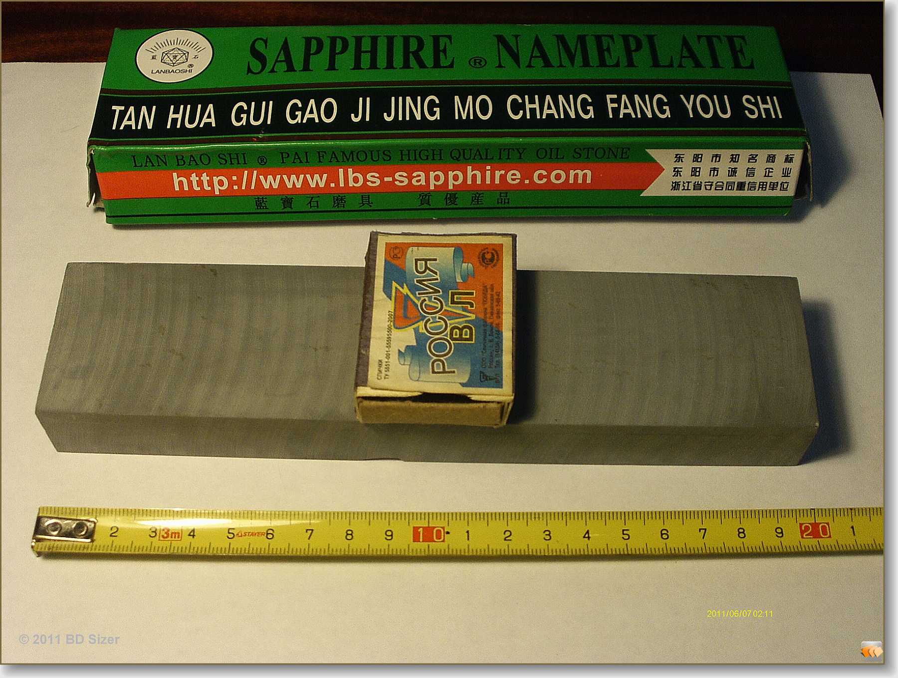 Камень со священной горы Феникса (в Китае всего 5 священных гор). Гритность около 3000 на мой взляд (сравнивал с исскуственным 3000). Камень без посторонних включений, натуральный, легко выравнивается на стекле с крошкой от неводостойкой наждачки. Точит неплохо. Размер 11х4х1 см