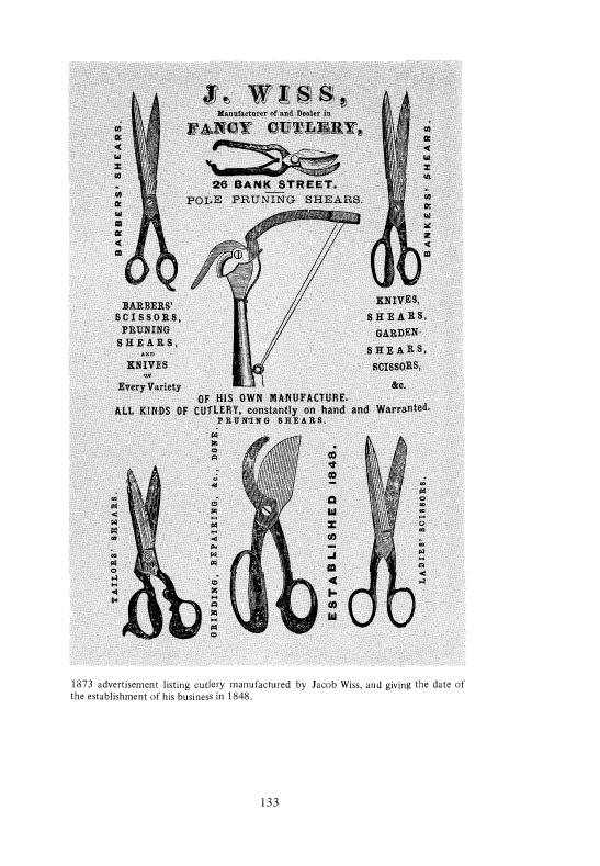 Rochus Heinisch и Jacob Wiss были пожалуй два из самых важных производителей портных ножниц на протяжении 19 ст. Rochus Heinisclt родился в Богемии, Австрия.? 14 февраля 1801 г. Он изучал производство хирургических инструментов в Австрии и Франции. В начале 1820 годов он переехал в США, вскоре после прибытия его посетила идея о производстве ножниц из ковкого чугуна где и сталкивается со сталью. Он был первым, кто запатентовал "портные" ножницы и первый, кто запатентовал сварку стальных изделий. Он начал производство своих усовершенствованных ножниц в Элизабет, Нью-Джерси в I829, но через несколько лет переехал в Ньюарк, где он основал дело по изготовлению столовых приборов . В 1835 Ньюарк каталоге он был указан в качестве производителя хирургических инструментов и других приборов в том числе и столовых при Карьер-стрит возле Вашингтон-стрит. Через годы его главной работой было изготовление ножниц для портных (своих запатентованных), которые оказались очень пригодными и очень ценными для тех, кто был в этой сфере деятельности. Ножницы, которые ранее использовали были английского производства и ручки были настолько неудобной формы, что портные называли "их "инструментами для пыток". Говорили, что "Его" ножницами, один человек может сделать столько, сколько сделают четыре человека другими ножницами. 131 страница Иаков Wiss родился в Soleure, Швейцарии. Я декабря 1817 года изучал торговля хирургического инструмента и производителей в этом городе. После завершения своего обучения он работал как подмастерье, в других частях "Европы. 'В Августе I847 года Он переехал в Нью-Йорк. От туда он отправился в Ньюарк, где он устроился на короткое время и Rochus Heinisch Затем начал свой бизнес . В 1848 году в каталоге он представлен как ножовщик и оружейник на 7-й Банк-стрит. Однако в этом списке он был всего лишь год.Его праправнук Nonnan Wiss, сказал мне, что он уверен, что прапрадед не имел отношение к оружейному делу. Он считает, что друг (Иакова) , который прибыл из Европы в Ньюарк и на некоторое время, и есть тот самый оружейник. 132 страницаКогда Иаков впервые занялся своим бизнесом, движущей силой для его станков служила (механическая энергия) Но в I853, когда он переехали на 26 Street он начал использовать паровую энергию. Благодаря популярности его столовыми приборами он был вынужден расшириться в 1869 году и снова в 1872, для повышения производственных мощностей. После смерти Иакова 25 июня. 1880 года его сыновья Фредерик CJ. Висс и Луис Т. Висс, взял на себя управление компанией. Бизнес продолжал развиваться, и в 1887 году Они построили большой завод на 33 Литтлтон Avenue, Newark. Хотя Рохус Heinisch и Иакова Висс, изготавливали и другие приборы, такие как: ножницы, ножи, бритвы. и тому подобное, их основной частью (направлением) были портные ножницы. Рохус Heinisch в частности гордился патентом, которым он обладал на свои портные ножницы, и тем, что Он показал всему миру Их. Он ставил дату патента на ножницах, что было хорошей рекламой. Самые ранние из этих дат, которые видели, были 1859 года.(на ножницах) но несомненно, были и более ранние. Его последний Патент был внесен в 1863 году. Хоть и есть сведения, что Иаков Висс также ставил номера патентов, как рекламу, на свои ножницы, но таковы не попадались. Можно было бы полагать,(для большинства) что Иаков Wises Рохус Heinisch являясь основными конкурентами, враждовали по отношению к друг другу, по всем 
