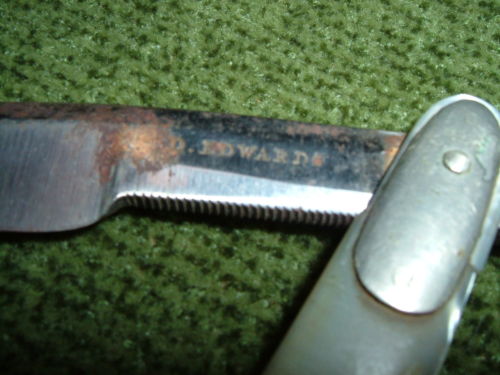 EDWARDSНедавно в руки попала одна крайне приметная бритва. На эрле лишь одно клеймо EDWARDS, никаких других опознавательных знаков и чего либо приметного не нашел. Шайбы очень похожи на старые батчеровские, рукоять черепаха в очень потрепанном состоянии. По геометрии очень близка к клину. Небольшая миниатюрная бритва длиной 12. 5 см. с необычной почти прозрачной черепаховой ручкой.