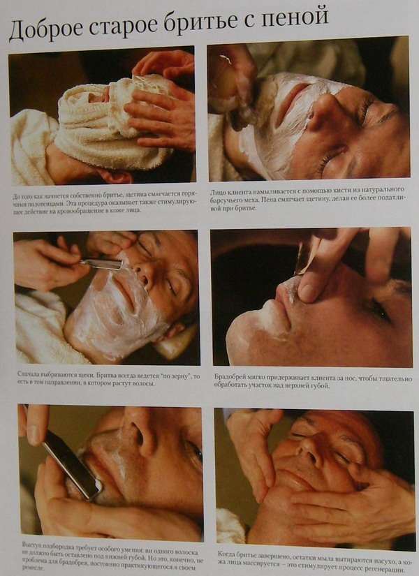 опускают бритву в стаканчик с тёплой водой и держат ее в нем несколько секунд. По поводу с низу в верх и с верха в низ. У меня четыре разных источника с картинками (а может и пять) где примерно поровну дается снизу и сверху. У меня сложилось впечатление что снизу вверх это из источников для брадобреев, т.е. тех кто бреет других. Так как он стоит за спиной и ему удобнее и безопаснее брить на себя (есть с фотками брадобрея). Вообще по сети гуляет несколько статей про само бритье и все с картинками. Одно точно выдержки из советского учебника для парикмахеров, два на английском языке, в одном из которых и для тех кто бреет и кто сам бреется. ну и несколько видеороликов.