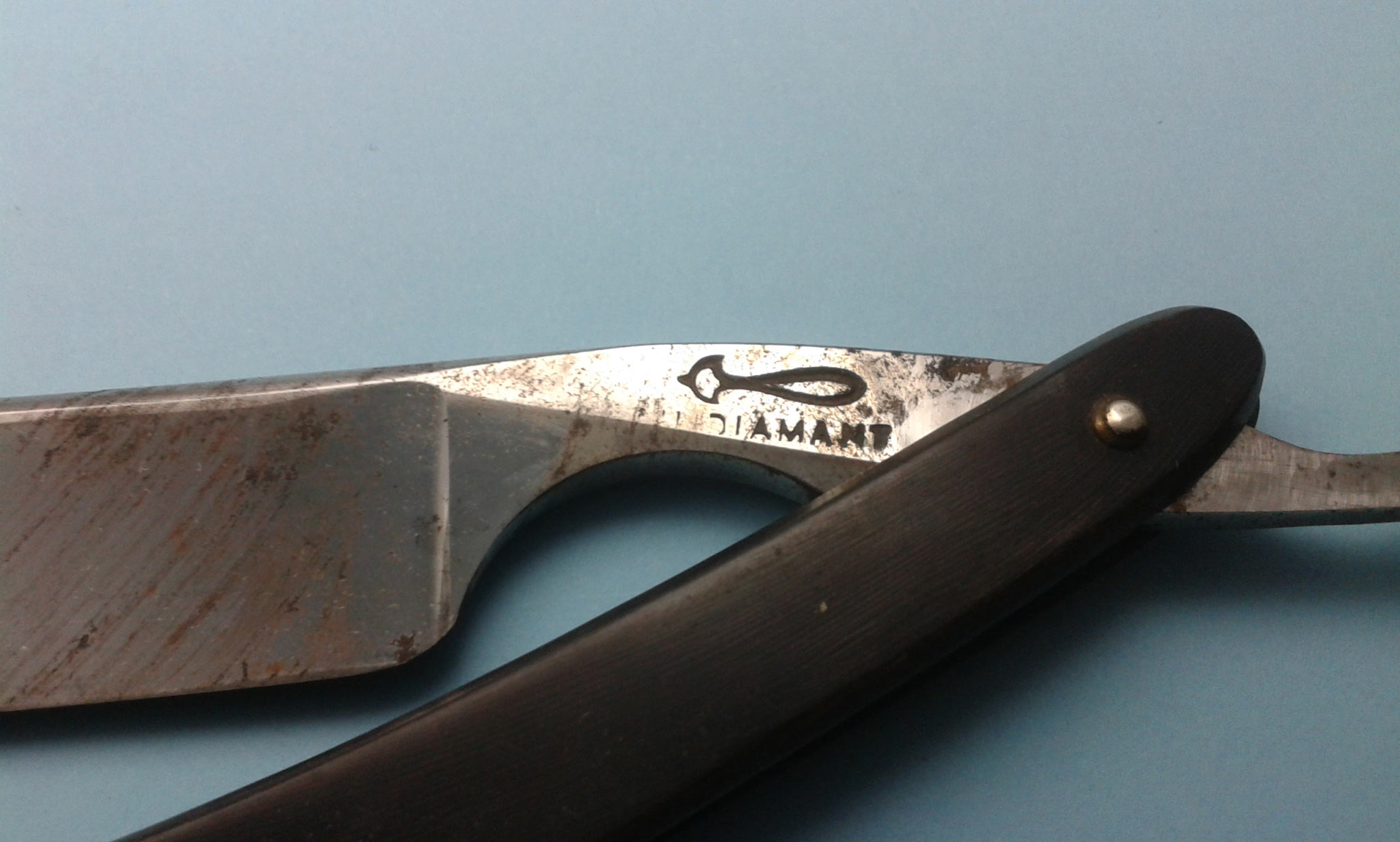 Почему отнес к Франции: 1. Diamant французское слово, употреблялось и на бритвах других стран, но редко. 2. Ручка из рога, клинышек из кости, судя по пинам ручка родная, да и сами пины на Францию указывают. 3. Общая несхожесть форм с Англией....с Германией, помимо формы и геометрии, еще и временные периоды разные, скорее всего. Есть ли у кого инфа по фирме?