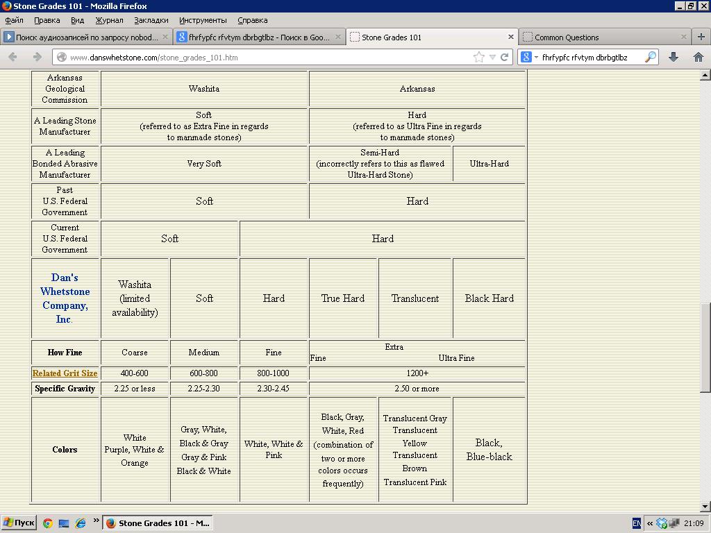 Нет необходимости подробно останавливаться на одном из самых известных точильных камней, поэтому построю сообщение в проблемном стиле по заявленной тематике и приравняю арканзасы к ... бельгийцам, т.к. при выборе новичка у них очень много общего. Но для начала немного общей информации. Spoiler Show Основные современные добытчики (они же магазины) - это Dan’s Whetstone Company (http://www.danswhetstone.com), Hall’s Arkansas Oilstones (http://www.hallsharpstones.com) и Norton Company (http://www.nortonstones.com). Norton – старейший добытчик, поэтому высока вероятность, что винтажные нортоны высокого качества. Придерживаясь классификации Dan’s Whetstone Company (а у каждого она своя), выделяют несколько типов арканзасов (см. табл. 1): Washita (Coarse, 400-600 грит, это сопутствующая порода), различного цвета, крупнопористый, требующий воды. Для обдирки (у бритв). * Встречается ещё LILY WHITE WASHITA и винтажные, которые уже Fine. Soft (Medium, 600-800 грит) – обычно светло-серый, непрозрачный, крупнопористый, требующий воды. Для обдирки и заточки. Hard (Fine, 800-1000 грит) - обычно серовато-белый, непрозрачный, мелкопористый, можно работать с маслом. Заточной. Далее идут доводочные камни, которые должны быть как можно однороднее по структуре и цвету. Данные разновидности - масляные камни (наносится несколько капель специального, вазелинового или оливкового масел), но возможно работа и с водой. True Hard (Extra Fine, 1200+ грит) - разного цвета, ценится белый. Translucent (Extra Fine, 1200+ грит) - обычно светлого цвета, однородный и полупрозрачный (отсюда и название), никаких вкраплений и полос другого цвета быть не должно. Много положительных отзывов о полупрозрачных светло-желтого и воскового цветов. Black Hard (Ultra Fine, 1200+ грит) - чёрного цвета, может быть с отливами тёмно-синего, -зелёного или -серого. Гораздо чаще можно встретить другую классификацию (например, у Norton ), где Black Hard считается менее тонким, чем Translucent. И последний иногда обозначают как 1400 грит. Совсем давно, все арканзасы делились только на Soft и Hard. Однако, несмотря на отличия в названиях суть одна – непрозрачные Soft и Hard являются обдирочными и заточными, а похожие на монокристалл, особенно пропускающие свет Black Hard и Translucent – доводочными. Гритность у природных камней, как известно, не отражает их свойств, как это обстоит у синтетиков, поэтому арканзас 1200+ амер. грит – это не 1200 яп. грит, а всего лишь ориентир на то, что камень доводочный. Пользователи на основании своих ощущений считают, что Black Hard и Translucent выдает до 8 Кгрит, и даже выше, особенно винтажные арканзасы, например, Norton-Pike. Магазины: 1. у производителя, ссылки выше. Цены Dan`s на скриншоте. 2. http://www.naturalwhetstone.com/productssharpening3.htm 3. http://www.ebay.com/usr/naturalwhetstone 4. http://www.bestsharpeningstones.com/Ark ... Stones.htm - здесь аккуратнее. Фото камней можно посмотреть на указанных страничках, фото кромок и особенности работы с арканзасами можно почитать на ганзе (ссылка выше) и здесь - ссылка - это от OldTor, который перепробовал очень много арканзасов именно для заточки бритв. На этом можно было бы закончить, но остался открытым вопрос – стоит ли новичку для заточки бритвы выбрать арканзас? и, я бы добавил, и бельгийца. Их даже сравнивают - ссылка 1l и ссылка 2 1. Арканзас и бельгиец (coticule) являются природными камнями, следовательно, прогнозировать качество камня и говорить что-либо о нем заочно, не опробовав, нельзя. Кто бы что не говорил, но раньше было лучше. Любой минераолог скажет вам, что когда разрабатывается месторождение сливки снимаю