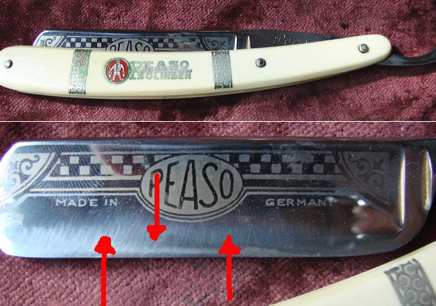 (цитата) Продаётся Соленгеновская бритва. Привезена из Германии. Обращайтесь на е-маил для более подробной информации. На бритве имеется граверовка, марка и модель. Это не подделка. Возможен торг. Цена: 500 Ls (1000$). Аукционы: плагиат, развод и "великолепные" описанияСегодня на молотке один "товарищ" предложил лот "Бритва опасная Золинген № 648519964", ERN цена 2500 рублей. Морщу лоб и вдруг меня осиняет. Открываю "бритву производителей" захожу в ЕRN, и о боже три фотки ERN размещенного в качестве примера на сайте? "Примус" с желтой перламутровой рукоятью, совпадает все, вплоть от номера на клинке и пятен ржавчины, он только немного осветлил фон. Написал этому негодяю показать лот с обратоной стороны, пока молчит. Но все же во избежание бросков других попросил администритора проверить лот.