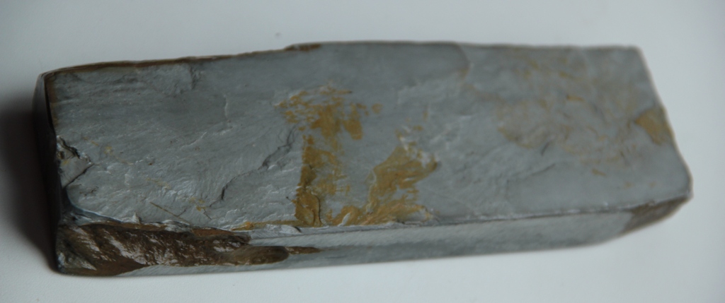 Визуально однородный без включений - есть 1 точка белая непонятная - на ней чуть цепляет - ну и + я при распиле камня поставил 2 запила длиной мм 2 толщиной и глубиной около 1/3 мм - корковый выход на поверхность оставшаяся в 1 месте - никакого влияния на заточку не оказывают..