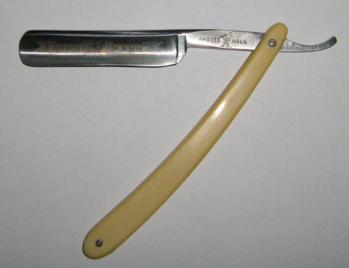 На сей раз опасная бритва досталась из антикварного магазина г. Минска. Теперь надо бы разузнать побольше о производителе итп. То, что 'Amboss' - наковальня, а 'Mann' - мужик, это понятно и по логотипу - мужик тащит наковальню (вообще-то похож на гнома, значит правильно будет "мужичёк тащит офигенную наковальню"  )
