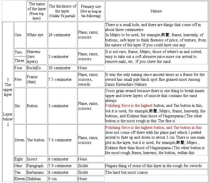 У Тешибы и по ссылке, данной unsui информации достаточно для ответа. Нижние слои - для грубой обработки. Тешиба прямо пишет, что 12 слой - шлак, а дядька с ban и atsu пишет, что у них колхозники для заточки кос их используют, хотя он заточил на них (на ! них как на оселке) бритву. Получается, по убыванию тонкости ботаны будут так - button, y-button, mishu, a atsu, ban и далее для обдирки.