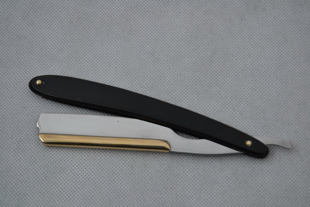 Английская бритва под торговой маркой Eclipse от Братьев Гилберт. Вогнутость 1/2, ширина 6/8. Необычная форма спинки. Новая ручка из рога буйвола насыщенной черно-белой расцветки. Рог очень высокого качества. В комплекте родной футляр гробиком в замечательном сохране. Заточена, готова к бритью. Продано Spoiler Show