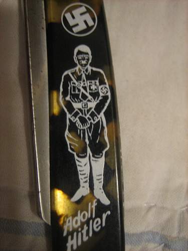 Re: Свастика и руны на опасных бритвах.Еще один Адольф, опять же Max Dörner Solingen. Причем не понятно что это: фотопечать или все же металлизированная вставка? Ручка похоже эбонит.