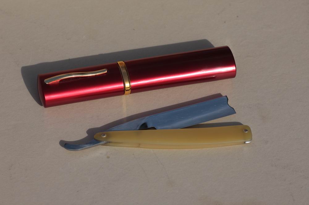 Re: Бритва до... и после...Исходный материал - неизвестное лезвие без ручки, с поврежденным полотном у носика. Сталь явно легированная и весьма круто прикаленая. Можно было либо заузить лезвие, либо укоротить. Я выбрал второе, поскольку мне нравится 5/8 сделал функциональную прочную ручку (клинышек алюминиевый, оси латунные 2.5 мм), для походов, причем бритовка теперь помещается в такой симпатичный футляр.