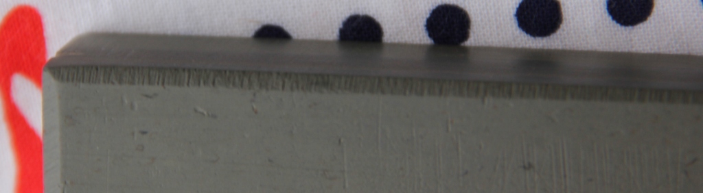 У меня в наличие два тюрингских сланца. Первый, темно-синий 5" ( длина 128мм, ширина 32мм) покупался здесь, второй - зеленый 5" (длина 126мм, ширина 38мм), заявленный как Эшер, покупался на ебэе. Оба очень мягкие ( сравнительно с Гуанси), легко остаются царапины. Cпил на торцевой стороне зеленого очень похож на фотографии сделанные уважаемым wren, у темно-синего следы от ножовки более грубые, и имеют одно направление.