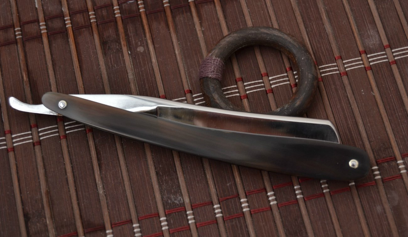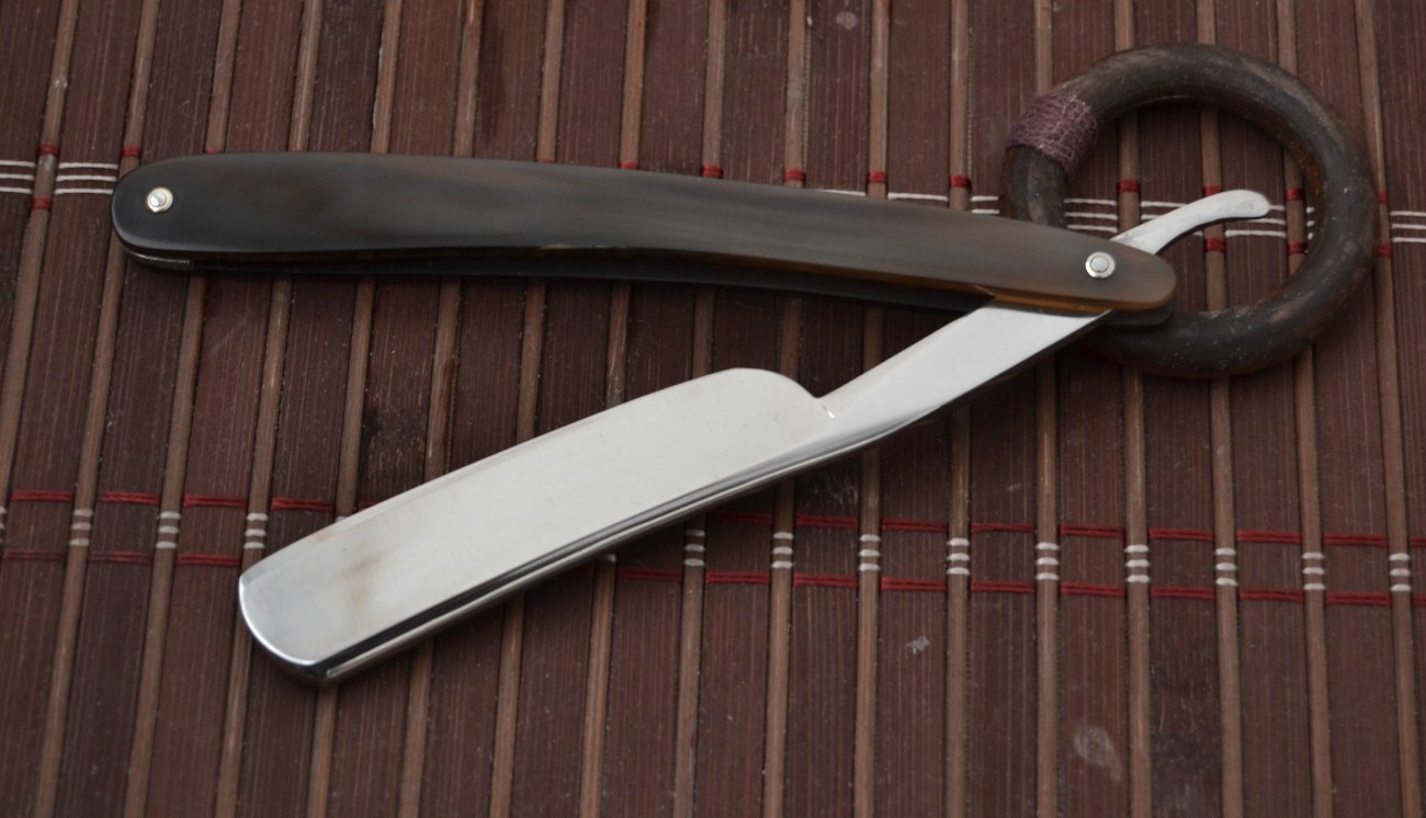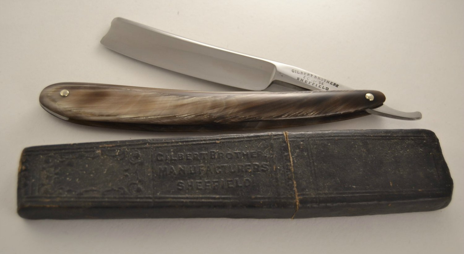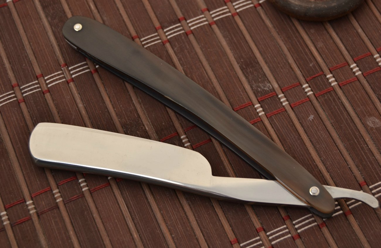 Английская бритва под торговой маркой Eclipse от Братьев Гилберт. Вогнутость 1/2, ширина 6/8. Необычная форма спинки. Новая ручка из рога буйвола насыщенной черно-белой расцветки. Рог очень высокого качества. В комплекте родной футляр гробиком в замечательном сохране. Заточена, готова к бритью. Продано Spoiler Show