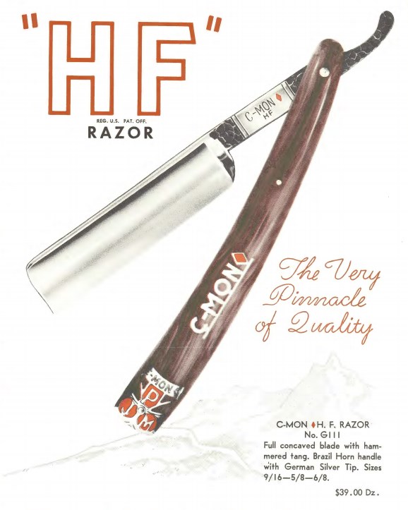Вот тут лежат три ежегодных каталога фирмы Peter J. Michels, дистрибьютора инструментов для салонов красоты и парикмахерских за 1953, 1954, 1963 годы. Каталоги номерные, номер 40, 41 и 50. Значит фирма работала все эти годы и, не нарушая нумерации, выпускала каталоги. скопировал все бритвы от туда: 1953 год Spoiler Show Spoiler Show 1963 год Spoiler Show Spoiler Show 1953 год C-MON - ROYAL № G100 размеры 9/16, 5/8, 6/8 Made in Germany - SUPER XX № G101 размеры 9/16, 5/8, 6/8 Made in Germany - SPECIAL № G113 размеры 9/16, 5/8, 6/8. Made in Germany - BLACKIE № G110 размеры 9/16, 5/8, 6/8. - HF (Hand Finished) № A111 размеры 9/16, 5/8, 6/8. Made in Germany - DELUXE № A112 размеры 9/16, 5/8, 6/8. - WEDGE № A114 размеры 9/16, 5/8. - GOLDIE № A115 размеры 9/16, 5/8, 6/8. A.I.C. - № 12, размер 6/8 - № 23, размер 6/8 - № 34, размер 9/16, 6/8 - № 45, размер 9/16, 6/8 MERIT - № A613, размер 9/16, 5/8. PRESTO - № G913 размер 5/8 SPEAR - № A713, размеры 9/16, 5/8, 6/8. - № G713, размеры 9/16, 5/8 TRU-EDGE - № G812 DELUXE размер 5/8 - № G813 SPECIAL размер 5/8 1954 год C-MON - SPECIAL № G113. размеры 9/16, 5/8, 6/8 - BLACKIE № G110 размеры 9/16, 5/8, 6/8 - SUPER XX № G101 размеры 9/16, 5/8, 6/8 - ROYAL № G100 размеры 9/16, 5/8 - H.F. № G111 размеры 9/16, 5/8, 6/8 - WEDGE № G114 размеры 9/16, 5/8 MERIT - № 613, размер 9/16, 5/8 SPEAR - № G713, размер 9/16, 5/8, 6/8. TRU-EDGE - DELUXE № G812 размер 9/16, 5/8 - SUPERBE № G813 размер 9/16, 5/8 1963 год C-MON - CADILLAC № G105. размеры 9/16, 5/8, 6/8 - BLACKIE № G110 размеры 9/16, 5/8, 6/8 - SPECIAL № G113. размеры 9/16, 5/8, 6/8 - HF № G111 размеры 9/16, 5/8, 6/8 - SUPER XX № G101 размеры 9/16, 5/8 - WEDGE № G114 размеры 9/16, 5/8 - Special WEDGE № 115 размеры 5/8 MERIT - № 613, размер 9/16, 5/8 SPEAR - № G713, размер 9/16, 5/8, 6/8 TRU-EDGE - DELUXE № G812 размер 9/16, 5/8 - SUPERB № G813 размер 9/16, 5/8 VULCAN № 193 размер 9/16, 5/8 GERMAN BLUE STEEL № 198 размер 9/16, 5/8 Re: Peter J. Michels, Brooclyn NY, Germany - Spear brandОсновная их торговая марка после 1945 года была, оказывается, вовсе не колокол со стрелой, а C-MON.