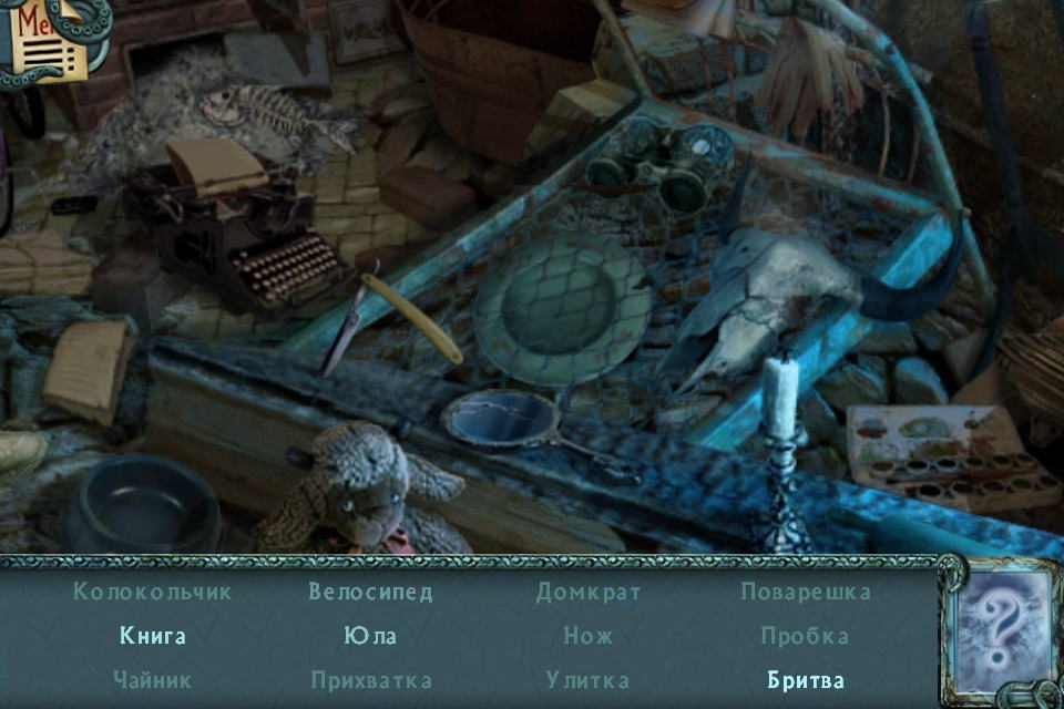 Опасная бритва в играхНесколько скринов из игры Twisted Town ("Гиблые Земли: Город Теней"). Квест с мини-играми и головоломками. В двух сценах из "поисков предметов" я обнаружил опасную бритву. Принцип головоломки: среди кучи вещей ищешь то, что написано в списке ниже картинки, тыкаешь в это пальцем, оно улетает из картинки и уходит из списка.