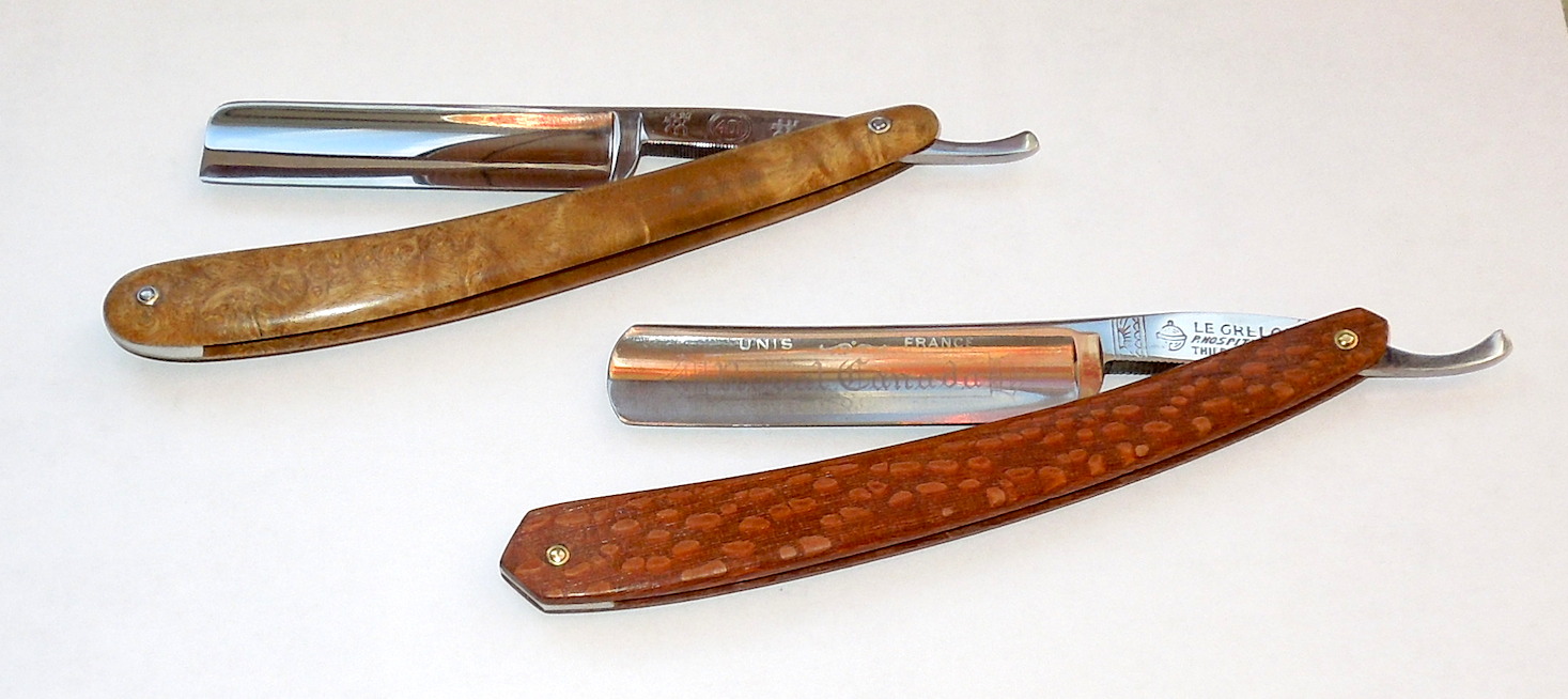 Еще парочка  Леопардовое дерево и стабилизированная древесина. Покрывал горячим карнаубским воском. Покрывать карнаубским воском с помощью фена просто фантастика да и твердеет сразу. Попробовал сделать клинышки из оловяного прутка  оказывается еще и проще чем с пластика (технология здесь на http://britva.ru/forum/viewtopic.php?p=86387#p86387" onclick="window.open(this.href);return false; форуме есть я просто в восторге!! СергейВ., спасибо!!) Питерцы или кто рядом, кому нужна древесина. Подъезжайте, пилите, подарок  Оловяный пруток 8 мм можно купить на "юноне"