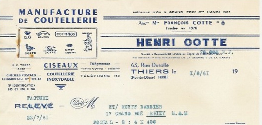 Пушку (как торговую марку) зарегистрировали в 1920 году С 1950 года владельцем производства был SARL Henri Cotte (наверное сын) в 1965 году (судя по наличию записи в справочнике) хорошо себя чувствовали. А бритва , скорее всего, 1920-1939 годов. Re: Помогите определить производителя ( COTTE )Большое спасибо за подробный ответ.