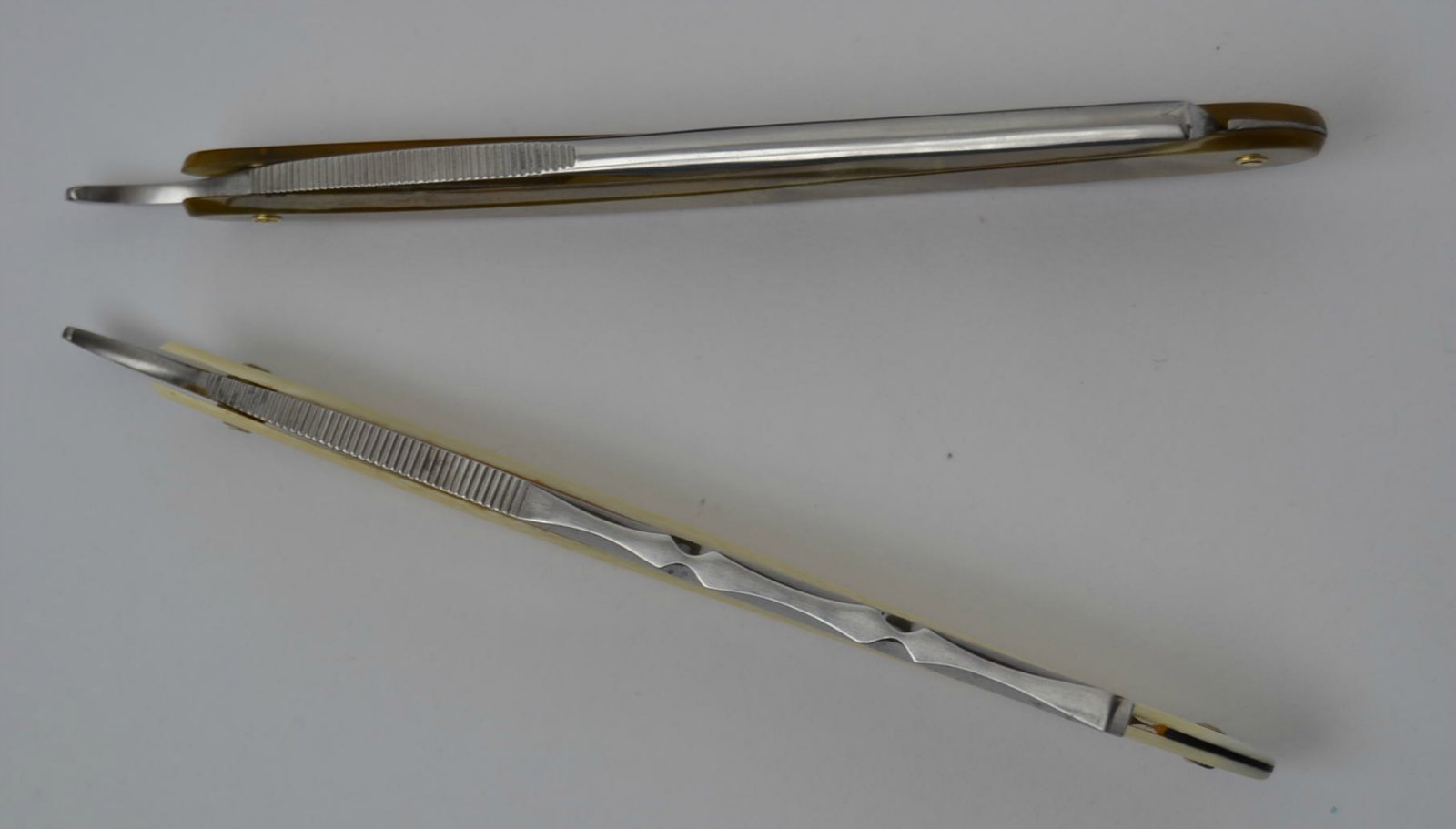 На одной Рукоять из слоновой кости, на другой целлулоид. Бритвы изначально не были в комплекте, но мне достались вместе, именно в этом футляре, поэтому и продаю тоже вместе. Бритвы отлично заточились, хорошо проходят тест на рез волоса сразу после камней. Рукоять из слона продолжает жить собственной жизнью, вчера после ремонта закрывалась ровно, сегодня после заточки стала закусывать. Целлулоид тоже закрывается не совсем ровно, хотя и не закусывает. ПРОДАНО. Так же могу продать по отдельности. Spoiler Show