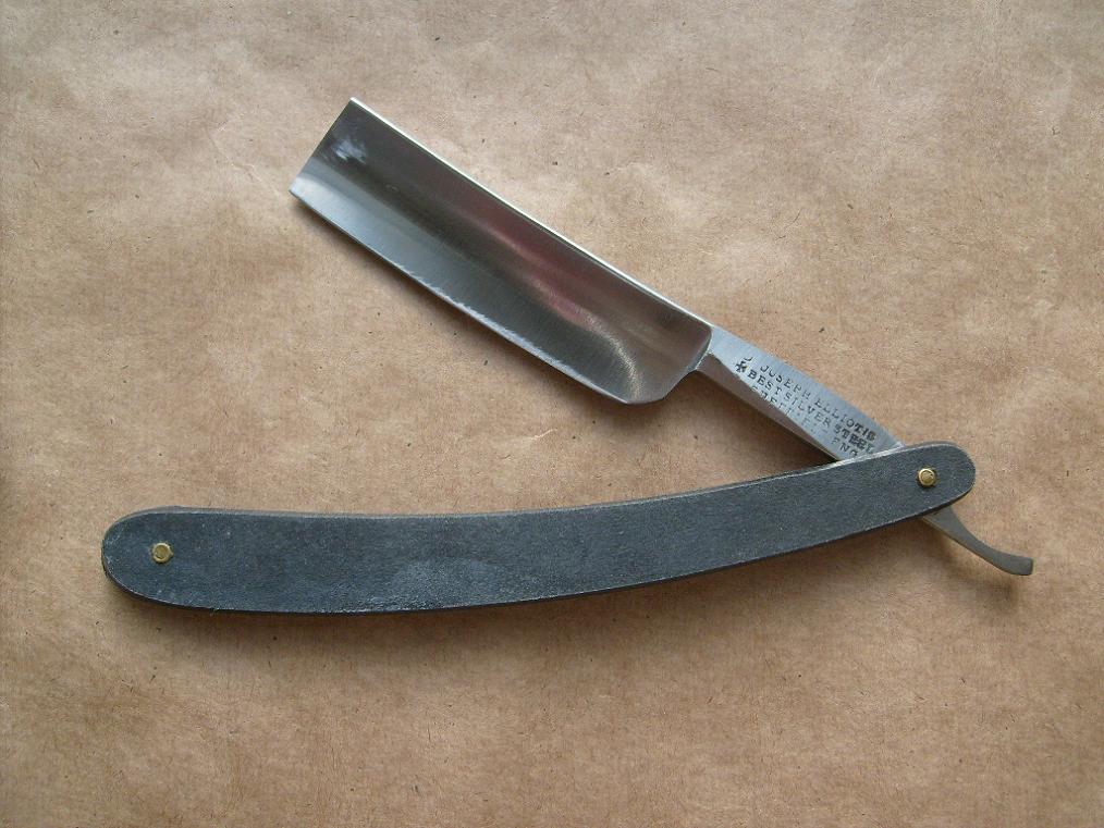 1. Бритва Erik Anton Berg (Eskilstuna Швеция). На стороне без клейма имеется овальное пятно (6 на 7 мм), по всей видимости, участок имевший коррозию, с которого она была удалена. Самой коррозии в нём нет, но оно углубляется на пару долей миллиметра в глубину. Мной никакие восстановительные манипуляции с клинком не предпринимались. Судя по обуху, бритва повторно (после фабрики) не затачивалась. Ширина 17 мм, толщина обуха почти 5 мм. Тип заточки hollow ground. (Вношу поправку в соответствии с нижеследующим вопросом. Тип заточки full hollow) Ручка родная, но вставка с акулой отсутствует, осталось только углубление точно повторяющее её форму. Бритва заточена и готова к бритью. По ощущениям сталь ближе к твёрдым немцам и чуть твёрже бритв Heljestrand. Цена 3500 руб. > 3200 руб. > 2900 руб. 2. Бритва Joseph Elliot. Silver Steel. Шеффилд. Англия. Ширина клинка 19,5 мм. Толщина обуха 5 мм. Длина от оси крепления 116 мм. Тип заточки: quarter hollow. Линия обуха и режущей кромки имеет слабый изгиб. С отдельных участков клинка была вручную удалена патина. Ручка, по видимому, прессованный картон. Заточена и готова к бритью. Цена 5000 руб. Дополнительная информация: Цена на бритву Heljestrand (фото на 4 странице) снижена до 3500 руб.