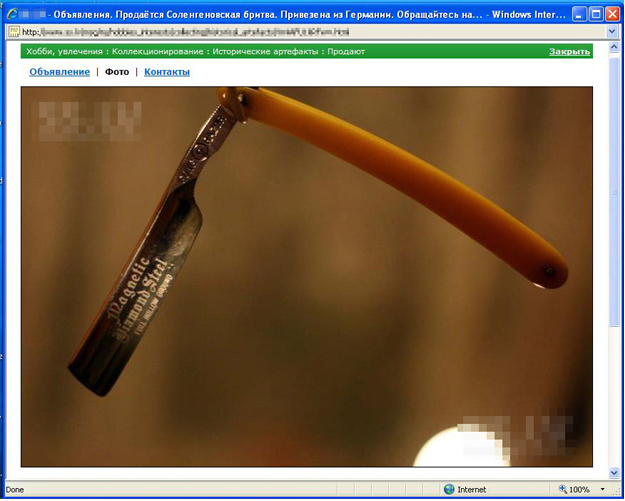 (цитата) Продаётся Соленгеновская бритва. Привезена из Германии. Обращайтесь на е-маил для более подробной информации. На бритве имеется граверовка, марка и модель. Это не подделка. Возможен торг. Цена: 500 Ls (1000$). Аукционы: плагиат, развод и "великолепные" описанияСегодня на молотке один "товарищ" предложил лот "Бритва опасная Золинген № 648519964", ERN цена 2500 рублей. Морщу лоб и вдруг меня осиняет. Открываю "бритву производителей" захожу в ЕRN, и о боже три фотки ERN размещенного в качестве примера на сайте? "Примус" с желтой перламутровой рукоятью, совпадает все, вплоть от номера на клинке и пятен ржавчины, он только немного осветлил фон. Написал этому негодяю показать лот с обратоной стороны, пока молчит. Но все же во избежание бросков других попросил администритора проверить лот.