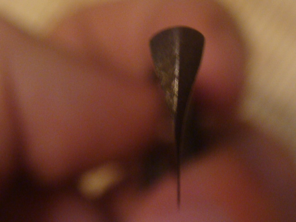 Итак: ручка не родная, "на вырост" с медыми пинами, очень похожа как у советской гравюры; отсутствие насечек на эрле, да и эрль узенький; на лезвии бритвы продольные следы устранения ржавчины наждачной бумагои и в то же время отсутствие следов абразива с торца головки (если она была отломана и потом обточена то как-то не логично); небольшой износ спинки и относительно ровная кромка....