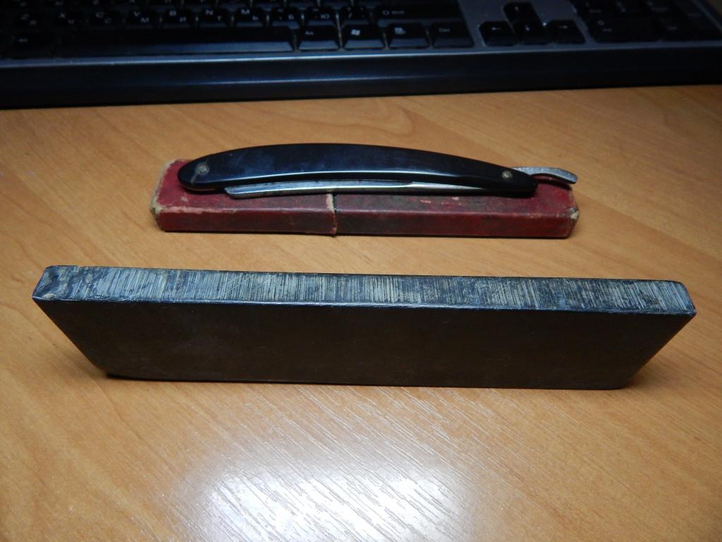 Камень тяжелый и очень твердый. Суспензии почти не дает. Грызет металл отлично. Кромка в зеркало. На ощупь зерно больше F63 однозначно. Размеры 214х48х15мм.Цвет сухого коричнево-серый, мокрого зеленоватый с желтыми крапинками. Под микроскопом поверхность кремнисто-стеклянная, очень плотная. Границы зерен видны только если есть разница по цвету. Основное зерно зеленоватое, вкрапления ораньжево-желтые. 32 года активно мусолю харю клинковой бритвой