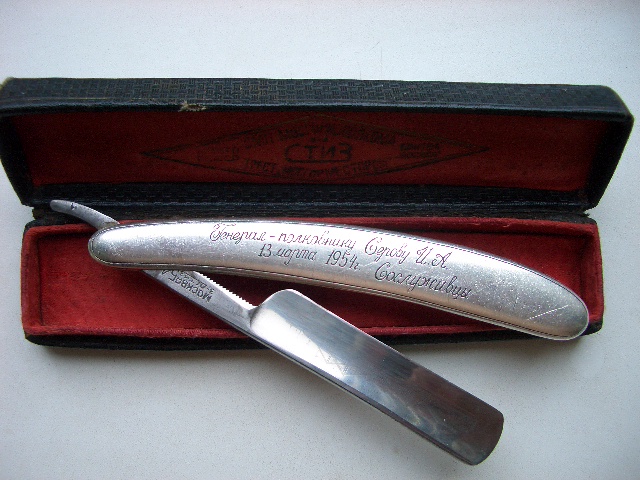 А инэт-то нафиг? Знаменитая бритва! Вот удача, повезло. Читайте: С марта 1954 года - председатель Комитета государственной безопасности (КГБ) при Совете Министров СССР. Вот это высокий ранг! Вот это бритва! Думаю это и есть причина подарка! Ни хрена себе чего ты в растворе замочил! Фигасе самопал! Читайте всё: Серов Иван Александрович - заместитель Народного Комиссара внутренних дел СССР, заместитель командующего войсками 1-го Белорусского фронта по делам гражданской администрации, генерал-полковник. Родился 25 августа 1905 года в селе Офимское Вологодского уезда Вологодской губернии, ныне Сокольского района Вологодской области, в крестьянской семье. Русский. Член ВКП(б)/КПСС с 1925 года. В Красной Армии с 1925 года, став курсантом Ленинградского артиллерийского военного училища. С 1928 года проходил службу в 22-й стрелковой дивизии: командиром взвода, помощником командира батареи, командиром батареи, помощником начальника штаба полка, начальником штаба полка. С 1935 года - слушатель Военной академии имени М.В. Фрунзе, которую окончил в 1939 году. С 9 февраля 1939 года И.А. Серов - заместитель начальника, с 18 февраля 1939 года - начальник Главного управления Рабоче-крестьянской милиции НКВД СССР. С 29 июля 1939 года - заместитель начальника Главного управления государственной безопасности НКВД СССР - начальник секретно-политического отдела. С сентября 1939 года нарком внутренних дел Украинской ССР. В феврале-июле 1941 года - первый заместитель наркома государственной безопасности СССР. В годы Великой Отечественной войны и в послевоенные годы, с июля 1941 года по февраль 1947 года Серов И.А. - заместитель наркома (с марта 1946 года - министра) внутренних дел СССР. Одновременно в апреле - июне 1945 года он заместитель командующего войсками 1-го Белорусского фронта по делам гражданской администрации. За умелое руководство делами, как в наркомате внутренних дел, так и в должности заместителя командующего фронтом и проявленные при этом решительность и мужество Указом Президиума Верховного Совета СССР от 29 мая 1945 года генерал-полковнику Серову Ивану Александровичу присвоено звание Героя Советского Союза с вручением ордена Ленина и медали «Золотая Звезда» (№ 6453). В июне 1945 года - ноябре 1946 года И.А. Серов - заместитель Главноначальствующего советской военной администрации в Германии по делам гражданской администрации. С февраля 1947 года - первый заместитель министра внутренних дел СССР. С марта 1954 года - председатель Комитета государственной безопасности (КГБ) при Совете Министров СССР. Указом Президиума Верховного Совета СССР от 8 августа 1955 года генерал-полковнику Серову И.А. присвоено высшее воинское звание «генерал армии». С декабря 1958 года генерал армии Серов И.А. - начальник Главного разведывательного управления (ГРУ) - заместитель начальника Генерального штаба Вооруженных Сил СССР. Депутат Верховного Совета СССР 1-го, 2-го, 5-го созывов. Член ЦК КПСС в 1956-1961 годах (кандидат в 1941-1956 годах). После разоблачения шпионской деятельности полковника ГРУ Пеньковского О.А., его бывший непосредственный начальник генерал армии Серов И.А. был обвинён в «потере бдительности» во вверенном ему Управлении и Указом Президиума Верховного Совета СССР от 12 марта 1963 года лишён звания Героя Советского Союза и ордена Ленина (Обана! прим Олег Бритва) . Понижен в воинском звании до генерал-майора. 