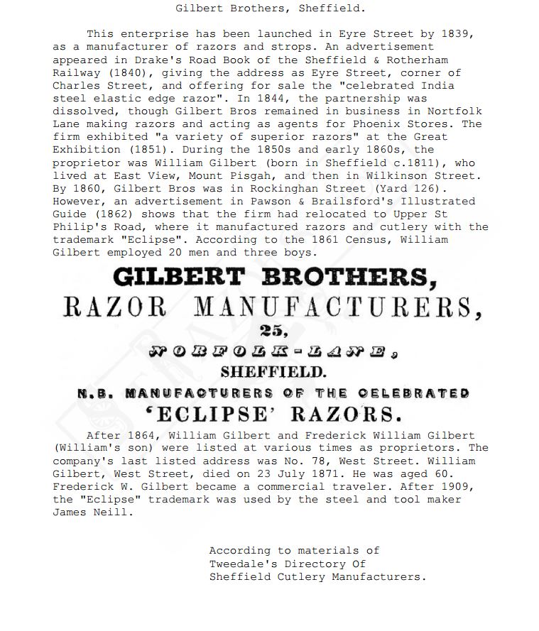 Гилберт Brothers, Шеффилд. Это предприятие было основано на Eyre Street в 1839 году, как производитель бритв и строп. Реклама появилась в Drake's Road Book of the Sheffield & Rotherham Railway (1840), публикуя адрес Eyre Street, угол Charles Street, и предложение продажи "Сelebrated India steel elastic edge razor". В 1844 году партнерство прекратилось, хотя GILBERT Bros остался в бизнесе в Nortfolk Lane, производя бритвы и действуя в качестве агента для магазинов Phoenix. Фирмой выставлены "разнообразные превосходные бритвы" на Большой выставке (1851). В течение 1850-х и начале 1860-х годов владельцем был Уильям Гильберт (родился в Шеффилде в 1811), жил в East View, Mount Pisgah, а затем на Wilkinson Street. В 1860 году фирма GILBERT Bros находилась на Rockinghan Street (Yard 126). Тем не менее, реклама в Pawson & Brailsford's Illustrated Guide (1862) показывает, что фирма переехала в Upper St Philip's Road, где изготавливались бритвы и столовые приборы с маркой "Eclipse". Согласно переписи 1861 года , Уильям Гильберт нанимал 20 мужчин и три мальчика. После 1864 года Уильям Гильберт и Фредерик Уильям Гильберт (сын Уильяма) были упомянуты в разное время, как собственники. Последний упомянутый адрес компании был No. 78, West Street. Уильям Гилберт, West Street, умер 23 июля 1871 года в возрасте 60 лет. Фредерик У. Гилберт стал коммивояжером. После 1909 года товарный знак "Eclipse" был использован производителем стальных изделий и инструмента James Neill. Согласно материалам Каталог Tweedale's Directory Of Sheffield Столовые приборы Производители оборудования. ТС просил опознать, но выложил в разделе "Оценка". Оценить не берусь - не специалист. Прошу обращаться ко мне на "ТЫ". На "ВЫ", только, если хотите со мной ругаться, либо пытаться в общении со мной повысить своё ЧСВ.