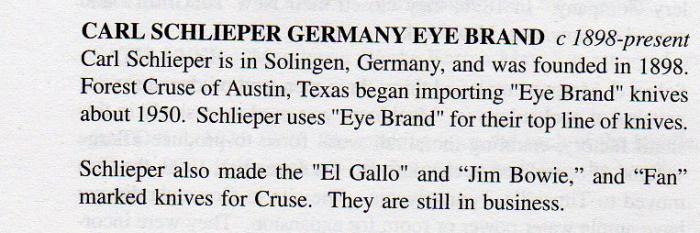 Смысл в том, что эта фирма скупала ножи и лезвия для бритв у мелких производителей в Золингене, по заказу Карла штамповали название Carl SCHLIEPER, рисовали "Глаза" (чем больше, тем дороже) и пихали на экспорт (в основном в колонии). Кроме того этот Карл, видимо, был ещё тот прохиндей: кроме глаза у него были десятки различных запатентованных логотипов, причем, на разных языках и в разных странах. Поэтому сейчас отличить "подлинник" от "подделки" практически невозможно - многие пошли по его пути. Прошу обращаться ко мне на "ТЫ". На "ВЫ", только, если хотите со мной ругаться, либо пытаться в общении со мной повысить своё ЧСВ.