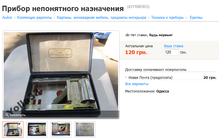 Re: Аукционы: плагиат, развод и "великолепные" описанияНу что товарищи, 2 предмета и такие непонятки, 1-й для опасных бритв и ножей, 2-й прибор неизвестного назначения.