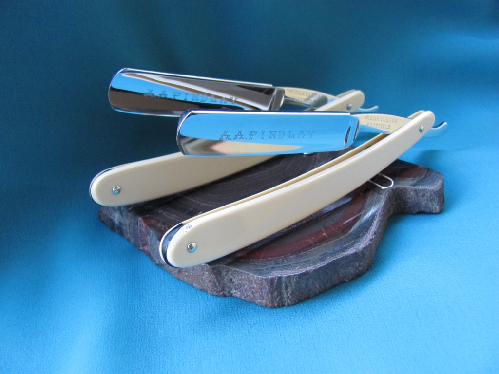 Производитель: W. Castleton. Sheffield На полотне надпись : A.A.Findlay Материал ручек: целлулоид. Размер бритв: №1 ширина 17 мм, обух 4.8 мм №2 ширина 15,2 мм, обух 4.8 мм Состояние: Близкое к идеальному, на одной из ручек, клинышек имеет визуальную деформацию, ни на что не влияющую, видимо время к нему оказалось не столь гуманным. Геометрия бритв идеальная. Заточены и готовы к бритью. Проданы A.A.Findlay Show