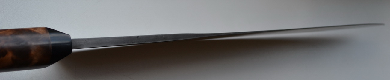 Re: Наши ножиАртельный таким и выпускался - у рукоятки для грубых работ обух 5-6мм в середине для нарезки и гибкиий кончик для филейных работ..легендарный кухонник - коллекционеры по всей России прочёсывают чтобы найти..