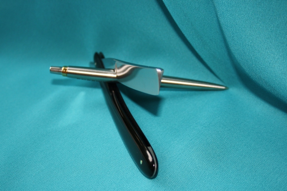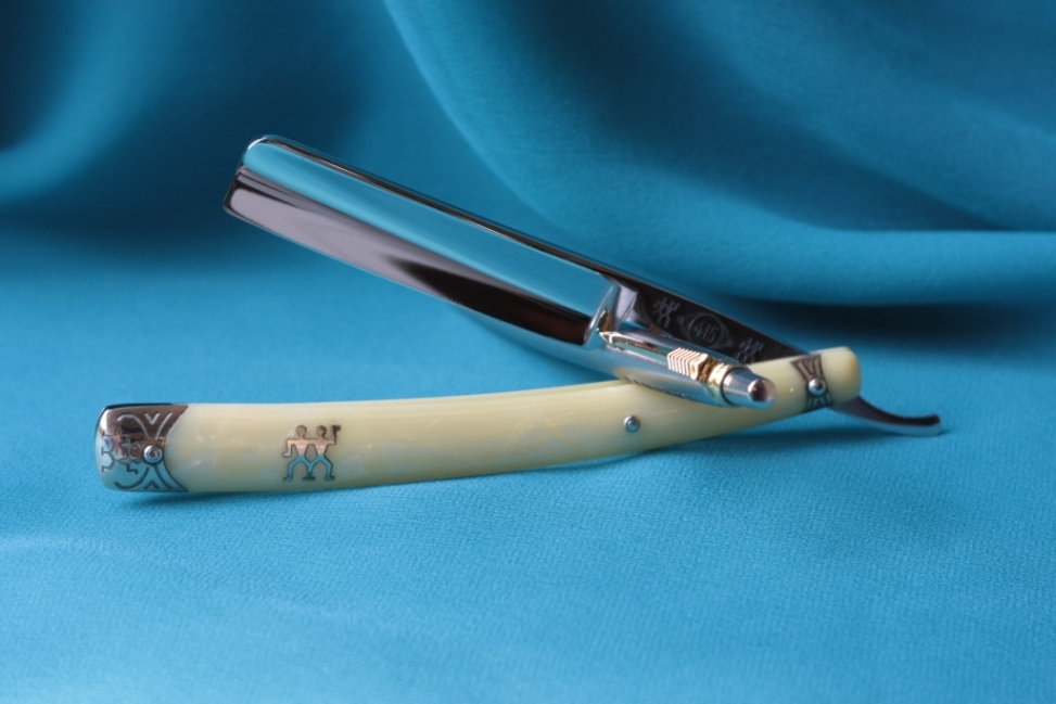 Производитель: J.A.Henckels. Twin Works. Solingen. Germany. Model 415 Размер: 5/8 ( а точнее ширина 16.5 мм.) Состояние: минимальное б.у., сохранность очень приятная, заточена и готова к бритью. Ручка из пластика, перламутровая, с медными наконечниками, одним словом -красивая. Цена: проданы близнецы Henckels Show