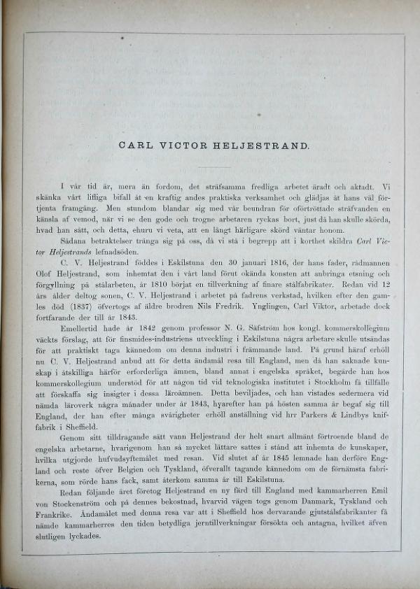 Spoiler Show Spoiler Show Heljestrand Knivfabrik grundades i Eskilstuna år 1808 av rådmannen Olof Heljestrand (1781-1837) som till Sverige tog den tidigare okända konsten att etsa och förgylla finare stålarbeten. Från början bestod tillverkningen bland annat av stålpennor, fickursfjädrar och sågar av stål, men efterhand flyttades tyngdpunkten och expertisen mot saxar, kirurgiska instrument och framför allt – rakknivar. Efter faderns död 1837 drevs företaget vidare av äldste sonen, Nils Fredrik Heljestrand (1808-1868). Redan då tillverkades stora mängder rakknivar i verkstaden och företaget hade mer än 32 anställda. Den yngre sonen Carl Victor (1816-1861), ofta förkortat C.V. i rakknivarnas stämplar, hade sedan liten lekt i fabrikens alla skrymslen och vrår. Redan vid 12 års ålder utförde Carl Victor enklare arbete i fabriken, och här skulle han också komma att stanna fram till 23 års ålder. Vid denna tid hade nämligen Kongliga Kommerskollegium väckt förslaget att främja finsmidesindustrins utveckling i Sverige genom att sända utvalda arbetare till främmande länder för att praktiskt ta lärdom och inspireras. C.V. Heljestrand erhöll därför ett erbjudande om att för detta syfte resa till England, men då han saknade åtskilliga av de krävda förkunskaperna, bland annat kunskaper i det engelska språket, fick han bidrag för att under några månader införskaffa sig dessa kunskaper vid Teknologiska Institutet i Stockholm (nuvarande Kungliga Tekniska Högskolan). Hösten 1943 begav sig C.V. Heljestrand så till England, där han så småningom erhöll anställning vid Parker’s & Lindby’s knivfabrik i Sheffield. Genom sitt trevliga sätt vann C.V. Heljestrand gillande och förtroende bland de engelska arbetarna, och han inhämtade så småningom de kunskaper som varit syftet med resan. Vid slutet av 1845 lämnade han därför England och reste via Belgien och Tyskland tillbaka till Sverige. Under hemresan passade han på att besöka Europas mest förnämsta och kända knivfabriker. Väl tillbaka i Eskilstuna några månader senare lyckades C.V. Heljestrand, efter många hinder, i ett av stadens sliphus få hyra en liten skrubb om 4 alnars bred och 8 alnars längd (1 aln = 0,59 meter). Här inreddes nu, så gott det lät sig göra, ett slipverk efter engelsk modell med flera slip- och polerställningar. Inom detta anspråkslösa område undervisade han och lärde upp flera arbetare i konsten att tillverka saxar och bordsgafflar, vilket han fortsatte med till hösten 1849. Vid denna tid hade ett annat av stadens sliphus blivit ledigt att arrendera, och C.V. Heljestrand skrev under arrendekontraktet för detta på 25 års tid - med vår tids mått mätt en osannolikt lång bindningstid för ett hyreskontrakt. Nu kunde C.V. Heljestrands verksamhet ta fart på riktigt. Men samtidigt med denna lilla framgång började fröet utveckla sig till den bröstsjukdom, vilken slutligen skulle bereda denna strävsamma och begåvade man livet. Troligen hade han ådragit sig denna tärande sjukdom under den treåriga vistelsen i den trånga, osunda lokalen. Men ännu fick han inte uteslutande ägna sig åt sin egen fabrik. Flera gånger anlitades hans erfarenhet och insikter av Sveriges andra framstående bruksmän, som önskade hans hjälp med att knyta affärsförbindelser med utlandets stora aktörer inom järnindustrin. För detta ändamål företog han ytterligare tre resor till främmande land: första gången (1851) med brukspatronen C.A. Rettig till England och Belgien; andra gången (1854) till England på bekostnad av brukspatron C.J. Olsson på Riddarehyttan, och slutligen år 1856, även denna gång till England med Kammarherren Stockenström. Genom alla dessa resor uppnåddes det åsyftade resultatet, vilket till stor del var Heljestrands förtjänst. C.V. Heljestrand kunde nu i lugn och ro, med största förhoppning om framgång, fortsätta sin egentliga sysselsättning: finsmidestillverkningen och framställandet av de bästa rakknivar som vårt land har skådat. Han fick även glädjen att se sina fabrikat erhålla de bästa vitsord, både inom och utom Sverige. Emellertid var hans kroppsliga krafter snart slut, och även om hans själ in i det sista ägde full spänstighet, lade en tärande lungsot honom i graven den 29:e juli 1861 vid blott 45 års ålder. Kort efter C.V. Heljestrands död stod att läsa i ”Post- och Inrikestidningar”: «Den aflidne har gjort sig känd för stor kunskap och nitisk verksamhet i smidesmanufakturen i allmänhet och särdeles i de finare stålarbeten, hvilka af honom sjelf tillverkades. Inom sitt samhälle verkade han mer än någon annan på samma gång och med samma nit för manufakturens befrämjande och det allmännas angelägenheter. Till och med sedan han intagit den sjuksäng han ej mer skulle lemna, meddelade han ofta sina tankar och råd i frågor rörande det allmänna med det sunda omdöme och den klart uppfattande förmåga, som var honom egen. Han är aktad och saknad af det samhälle han tillhörde, och förlusten är så mycket större, som den säkert länge blir oersättlig.»*Se källa C.V. Heljestrands rakknivar och fina stålprodukter uppmärksammades vid världsutställningarna i Paris 1855, Stockholm 1866, Bogotá 1875, Philadelphia 1876, Chicago 1883, Paris 1900 och 1937. Företaget drevs vidare i Eskilstuna av Heljestrands avkomlingar ända fram till 1980 då företaget gick i konkurs, främst på grund av avsaknaden av en marknad då Gillette och dess flerbladshyvel vid denna tid erövrat världen som mannens främsta rakverktyg. Maskinerna såldes därefter till Tanzania och det stora lagret av rakknivar föll i glömska. Eventuell kvarvarande rakknivstillverkning har flyttat utomlands till låglöneländer som Kina, och istället för svenskt stål användes nu företrädesvis kinesiskt och brittiskt stål vid tillverkningen. Idag tillverkas inte några rakknivar alls i Sverige. 200