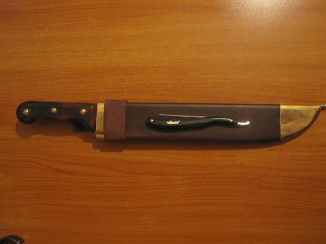 Re: Наши ножиУвидел в магазине замечательную железяку всего за 200 руб.,не смог пройти мимо.Зделал ножны,немного изменил рукоять и получилась такая штука.Бритва для масштаба.