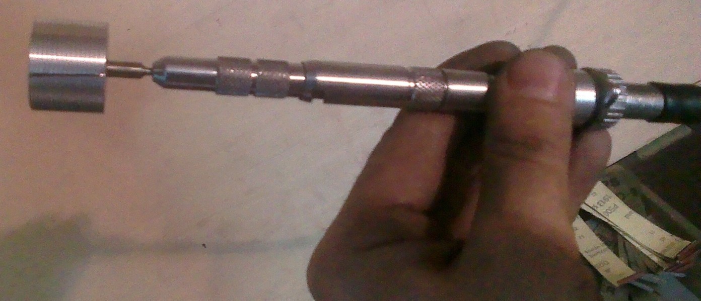 Позвал на помощь гугл. Оказалось, стомат. наконечник рассчитан на инструмент с хвостовиком 2,35. Пришлось уже более уверенно повторить процесс с контролем значений по лимбу микрометра. И таки оно получилось. На досуге сделаю ещё пару штук, чтоб каждая головка была под бумагу своей гритности.