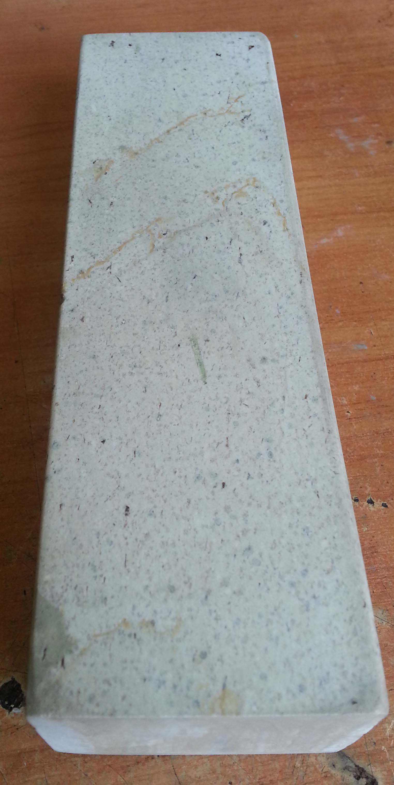 Не стал выпрямлять до конца, т.к. появилось подозрение, что камень искусственный и не настолько хорош, чтобы тратить на него силы и время. Пластину DMT coarse он очень пачкает какой-то масляной субстанцией, отмыть которую с пластины сложно. Возможно, это связка, если камень действительно искусственный? Или, может, масло, с которым использовался камень, проникшее в поры?
