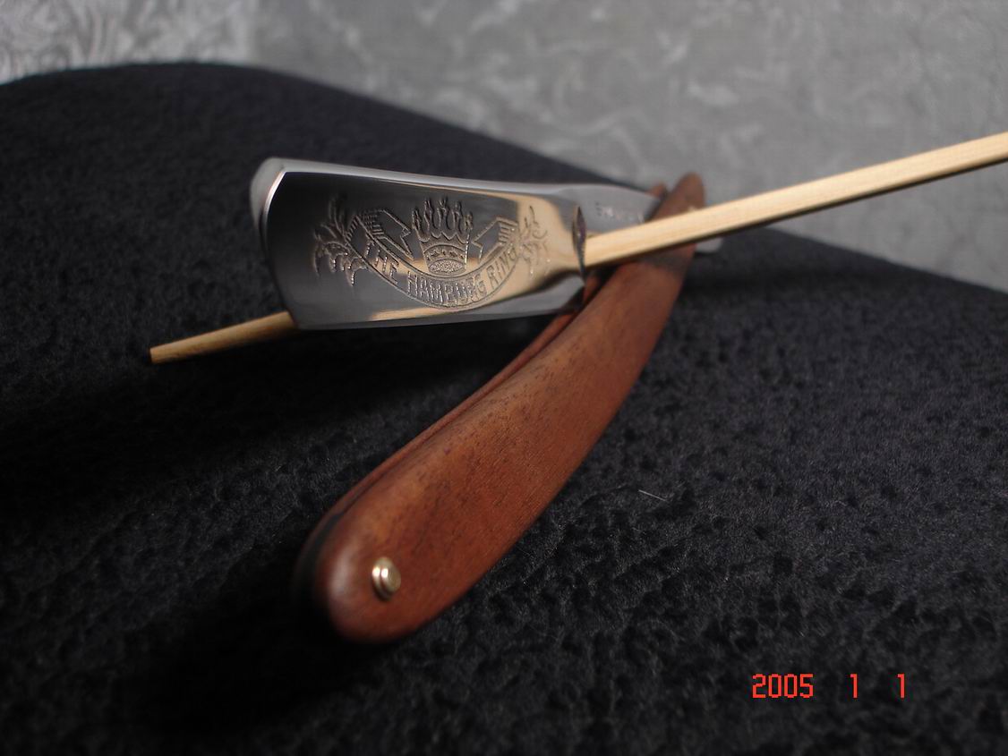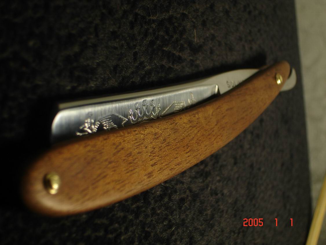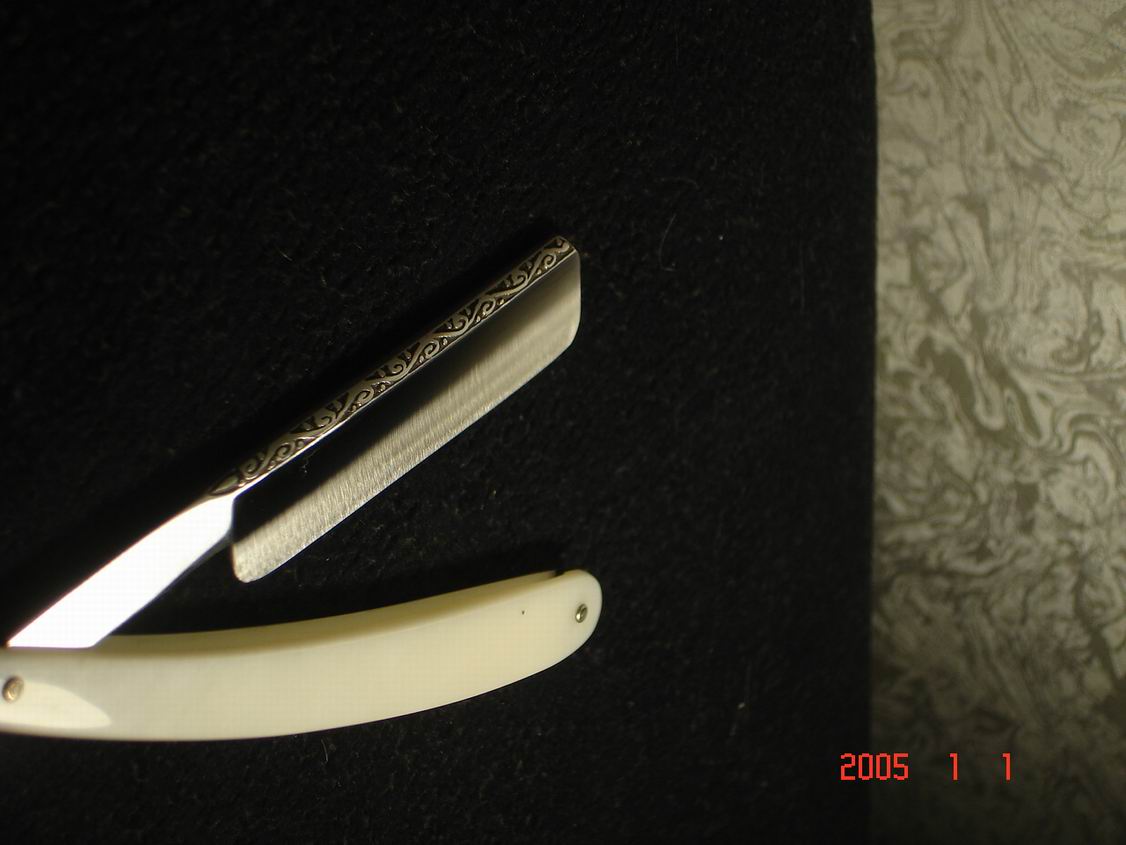 Скорее всего бритва в пользовании не была ,заводская шлифовка , бритва была разобрана , отполирована , ручка восстановлена , дополнил конструкцию шайбочками на осевом пине , что бы избежать трения ручки о полотно бритвы .