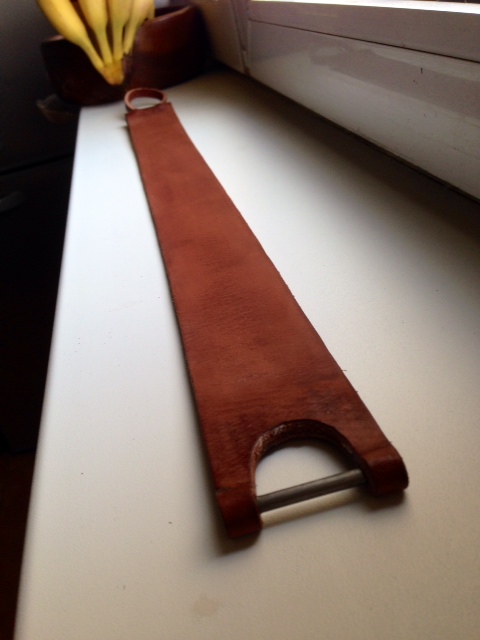 Re: Изготовление ремней для правкиИзделал такой вот ремень,кожа немецкого солдатского ремня,вымачивал,вытягивал и т.д.Подвес и ручка мне нравятся такие, какие и поставил,ну и к каждому своему ремню я шью брезентовый чехол,не знаю зачем
