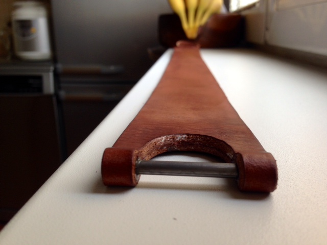 Re: Изготовление ремней для правкиИзделал такой вот ремень,кожа немецкого солдатского ремня,вымачивал,вытягивал и т.д.Подвес и ручка мне нравятся такие, какие и поставил,ну и к каждому своему ремню я шью брезентовый чехол,не знаю зачем