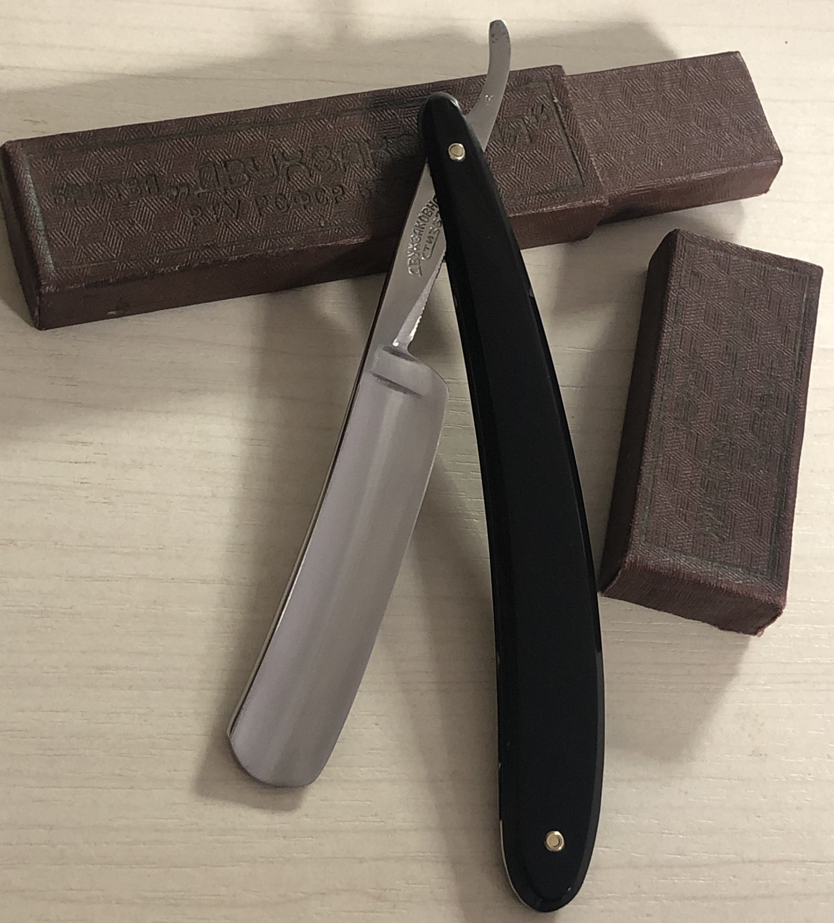 Бритва сталинских лет, в очень хорошем состоянии.Практически непользованная, возможно и вовсе не была в деле.(по крайней мере обушок не имел следов износа).Разобрал, почистил клинок, убрал небольшой скольчик с полотна и снова собрал, добавив внутренние шайбы и заменив пины.Оригинальный гринд полотна также попробовал повторить.Сталь чистая, без видимых и критичных дефектов. Идеальная геометрия:кромочка равномерна по всей длине.Коробочка стизовская тоже, но только от "особой".Заточена и готова к бритью.Относительно недорогой, но очень приятный экземпляр не только для новичка, но и для любого бритвомана.