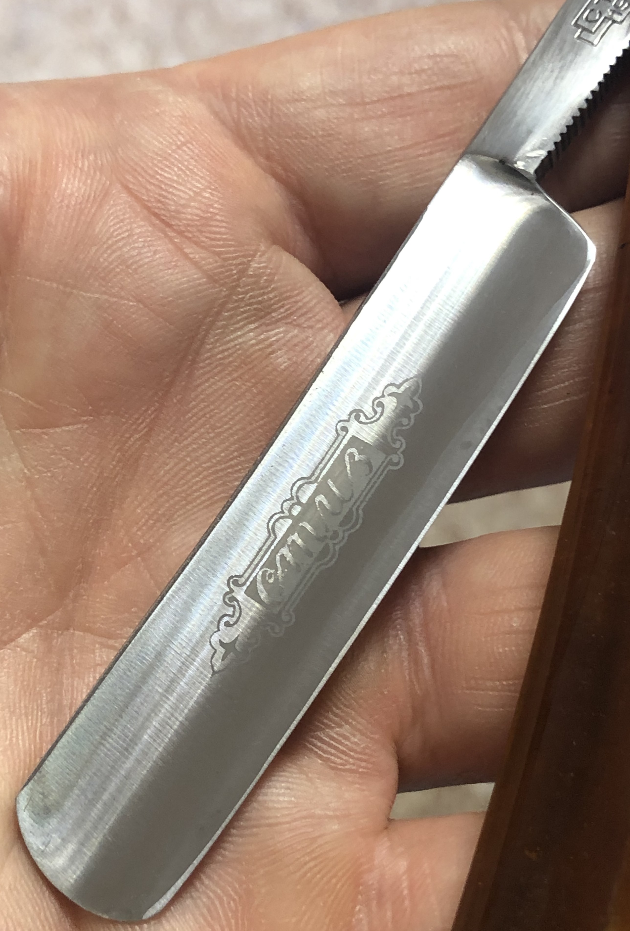 Бритву только оттер от остатков масла с консервации. Естественно, ничего не разбиралась и не ремонтировалось.Совершенно не тронута временем.Сталь не имеет никаких видимых дефектов.Нанесено покрытие от коррозии, а также можно увидеть чёткий переход от электро-химической, заводской заточки. Идеальная геометрия клинка. Бритву не точил пока.После продажи будет по желанию заточена.