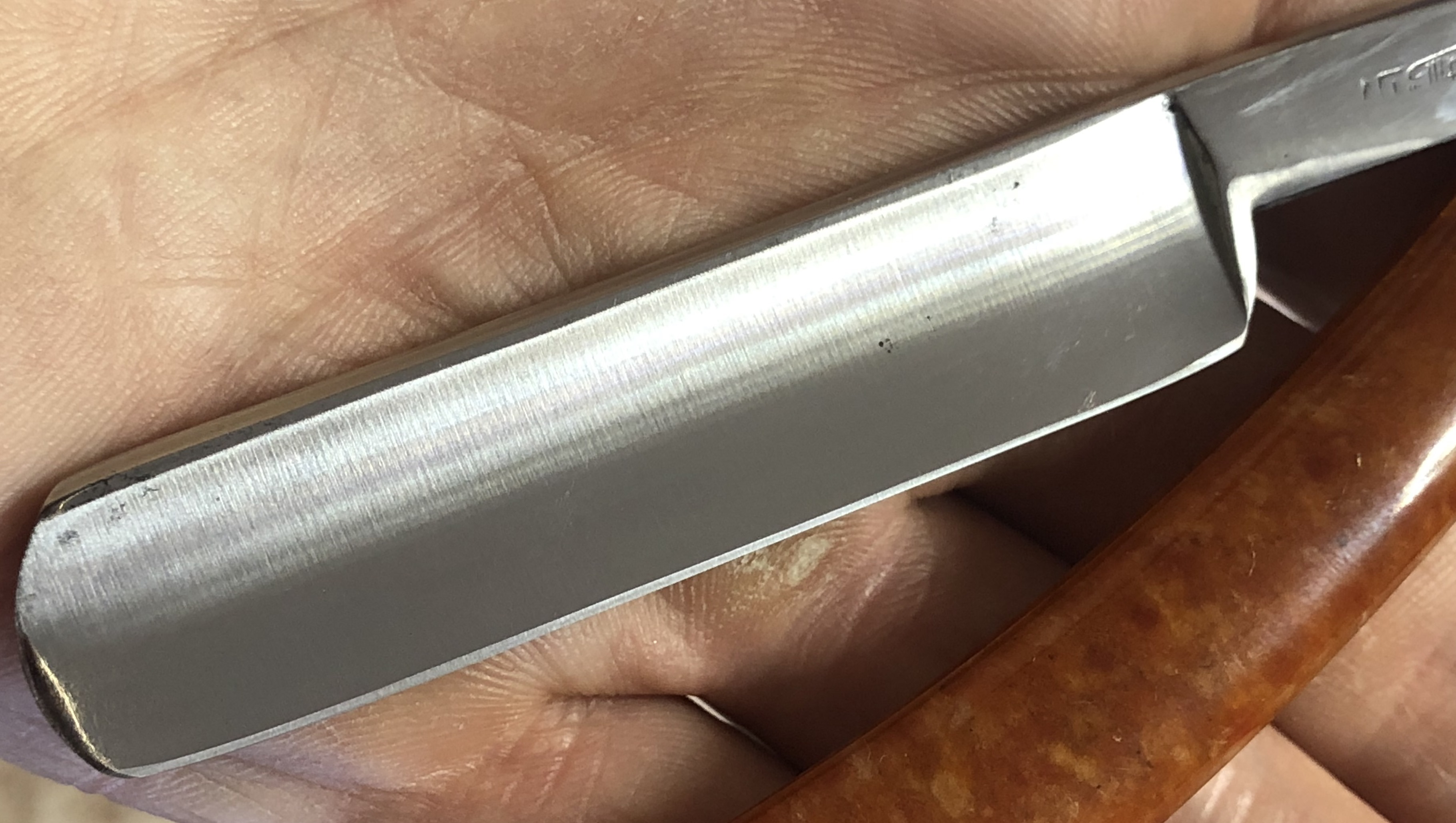 Клинок в очень хорошем состоянии.Немного исправил "обратную улыбку", почистил ,восстановил оригинальный гринд,в меру своих возможностей и отполировал.Касаемо оправы...Роговая, натуральная ручка ,древняя,от французского донора 19-го века.(Немного длинновата, конечно, но в любом случае лучше, чем какой то заводской пластик. ) Так как на оправе имелись довольно большие отверстия под пины, то мною было принято решение поставить именно такие шайбы, возможно крупные,зато надёжные.Сталь чистая, без видимых дефектов. Идеальная геометрия клинка:кромочка равномерна по всей длине.Бритва получилась немного тяжелее, по сравнению с бритвой в оригинальном исполнении.В любом случае,бритва приятна во всех отношениях. Брить должна неплохо. Заточена и готова к бритью.