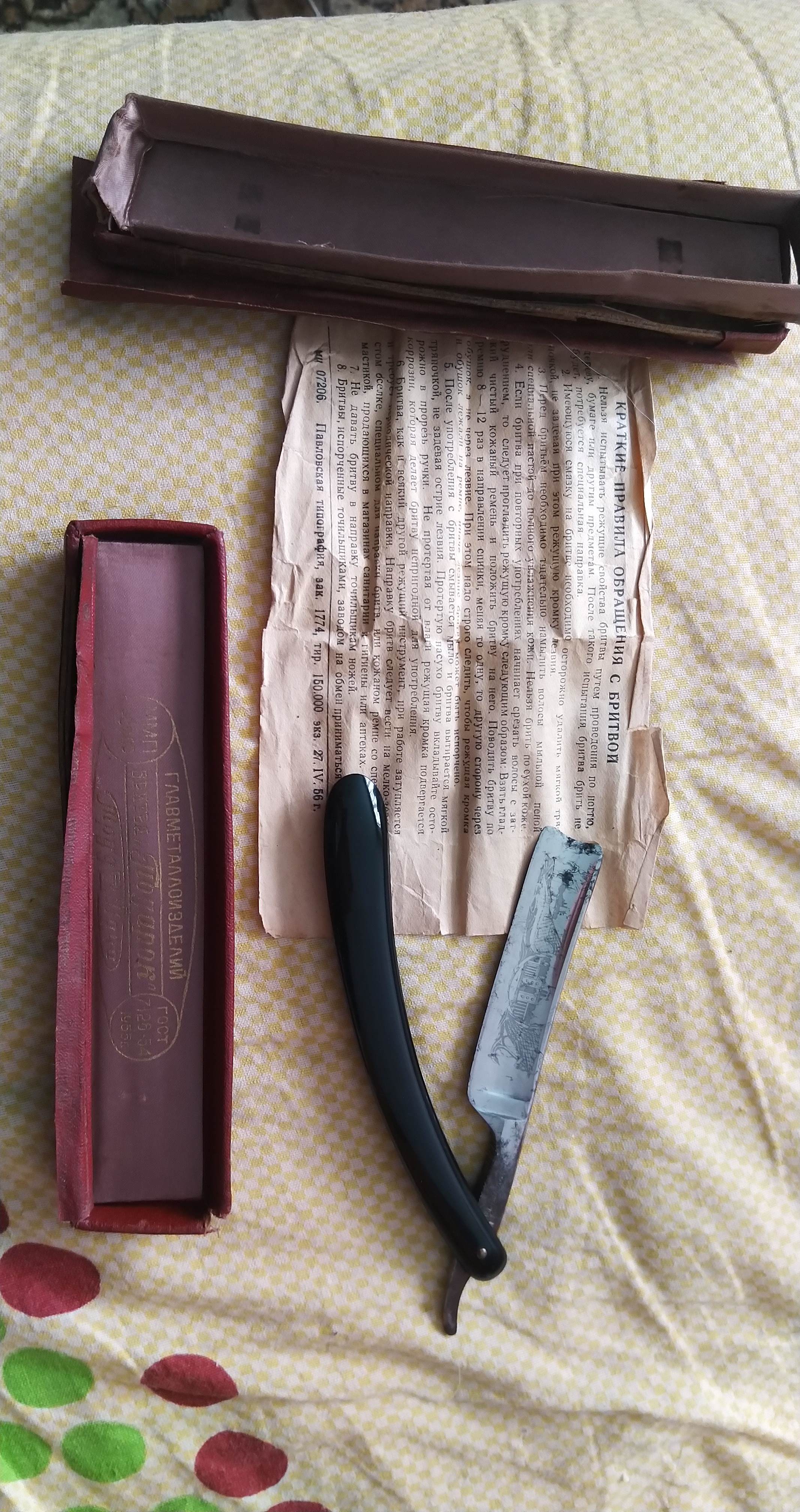 Во-2, наверное в первый раз осилил до конца прочитать оригинальные Вачские "Краткие правила обращения с бритвой".  И что, самое занятное, решил воспользоваться этими рекомендациями, и как наши предки попробовать с коробки побриться , предварительно стерев в клинка защитный слой и поправив бритву на ремне. После правки бритва проходила вполне уверенно тест на рез волоса. Бритье недельной бороды достаточно мягкое,с "металлическим" характером сбриваемой щетины. В общем и целом получил не только чистую и гладкую морду лица, но и истинное моральное удовлетворение от того,что удалось побриться бритвой, заточенной хрен знает когда, фиг знает кем. И, вполне удачно, я вам скажу..