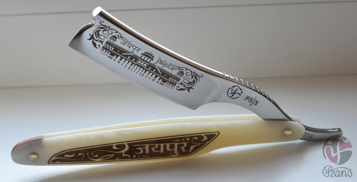 Бритва в индийском стиле RAJA Frans, Toivo, Gipson Сталь - У-12 Ширина - 7/8 Вогнутость - Клин Ручка - кость(верблюд) Лазерная гравировка металл/кость Не продана