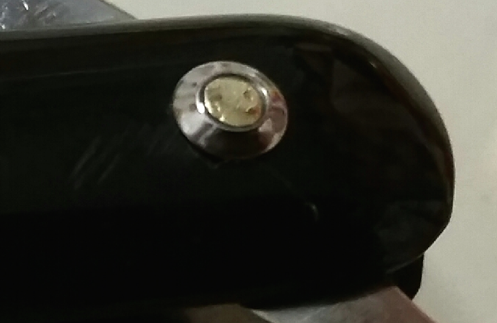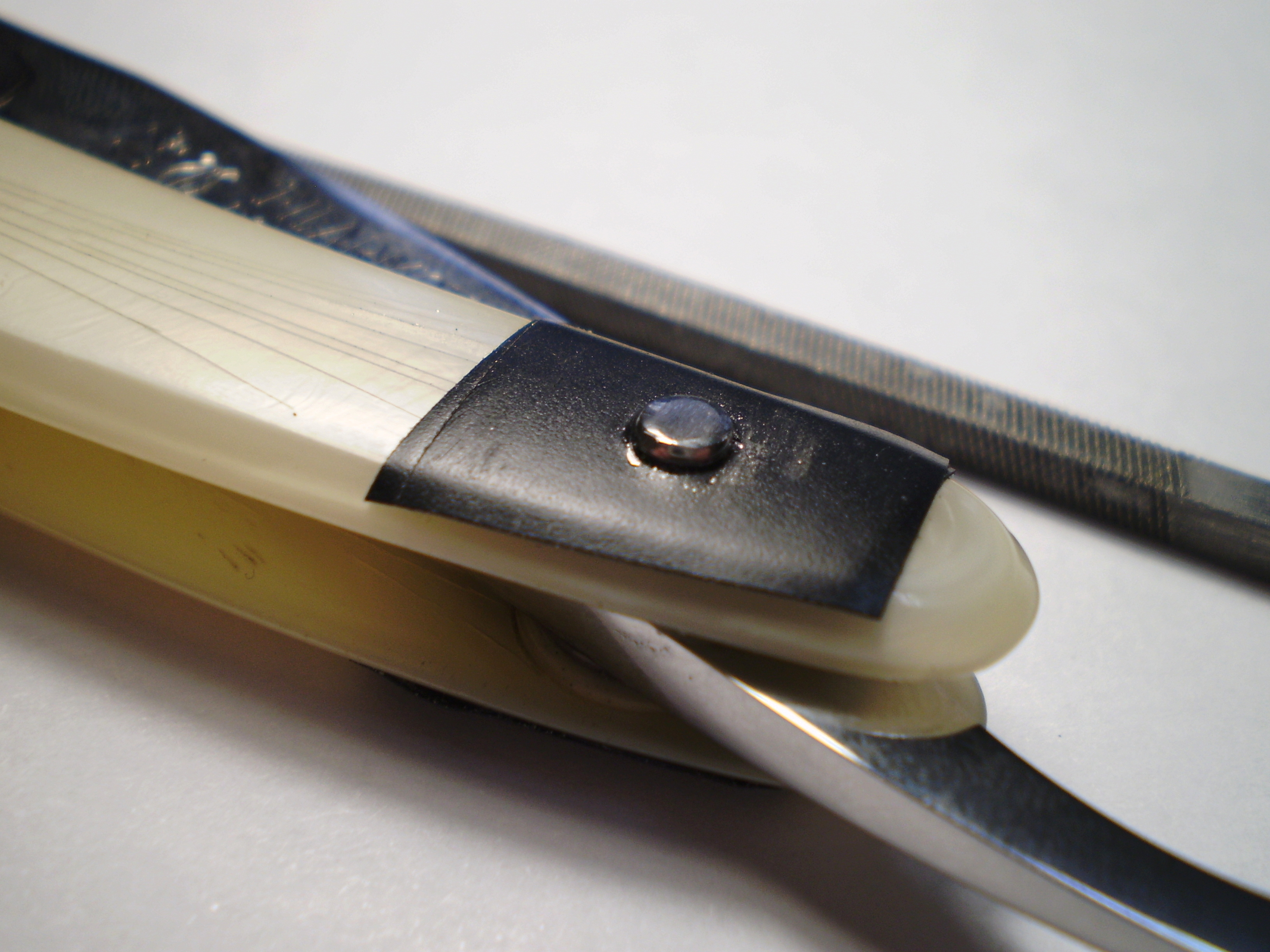 Заклёпки (пины) для бритв, установка, изготовлениеПин из люверса. Попалась бритва с отверстием 2.2 мм, проволока 1.8 мм казалась мелковата, решил использовать 2. И попробовать люверсы 2 мм, внешний диаметр 2.5 мм. Сточил ножку по длине под толщину плашки ручки, рассверлил отверстие под люверсы, померил. Откусил, заклепал. Пока получилось не очень аккуратно, но это первый опыт, буду стараться