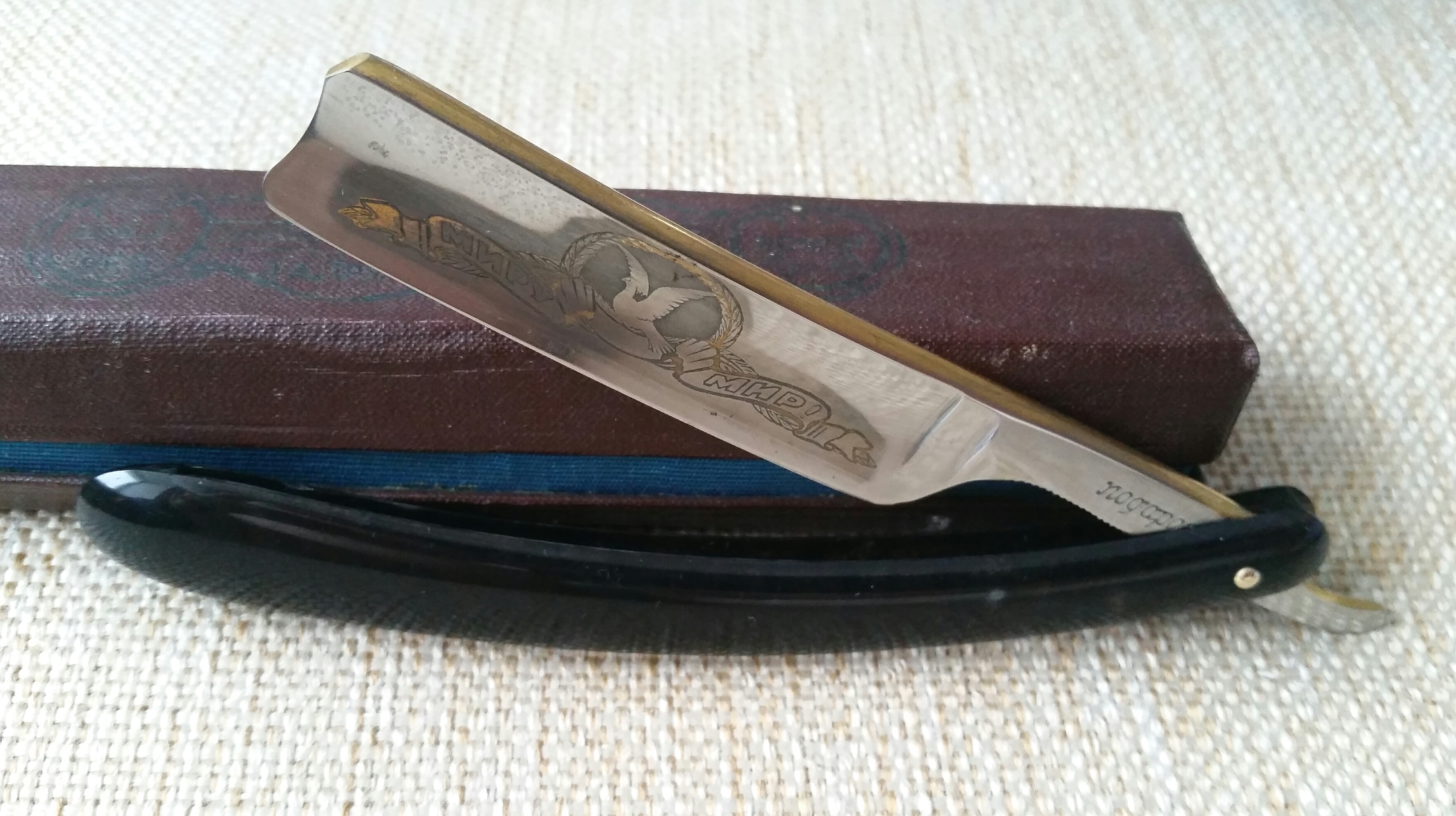 ЗТВ Подарок 56 г. Сюжет "Миру мир!", не частая бритва, барберский нос. Пришла в равномерной черной патине на всем полотне, и местами более серьезной коррозией, при таком раскладе всегда дилемма - почистить полностью и счистить гравюру или сохранить, при этом оставив где то следы или остатки. Считаю, что если гравюра повреждена безвозвратно, то счистить. Если можно как то сохранить, то это нужно сделать, без гравюры бритва теряет свою фишку. Чистил вручную, аккуратно, что то осталось по мелочи, но на мой вкус - не критично. Так же сохранил позолоту на обушке и носе