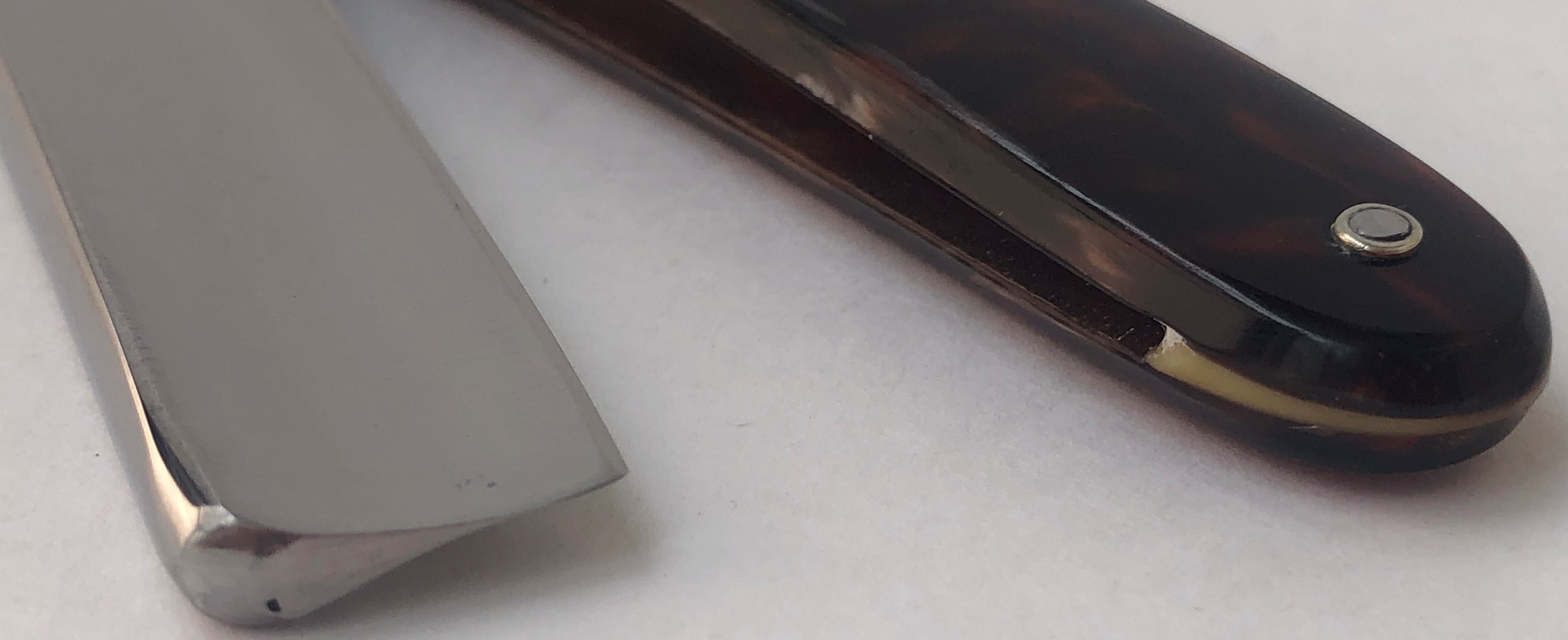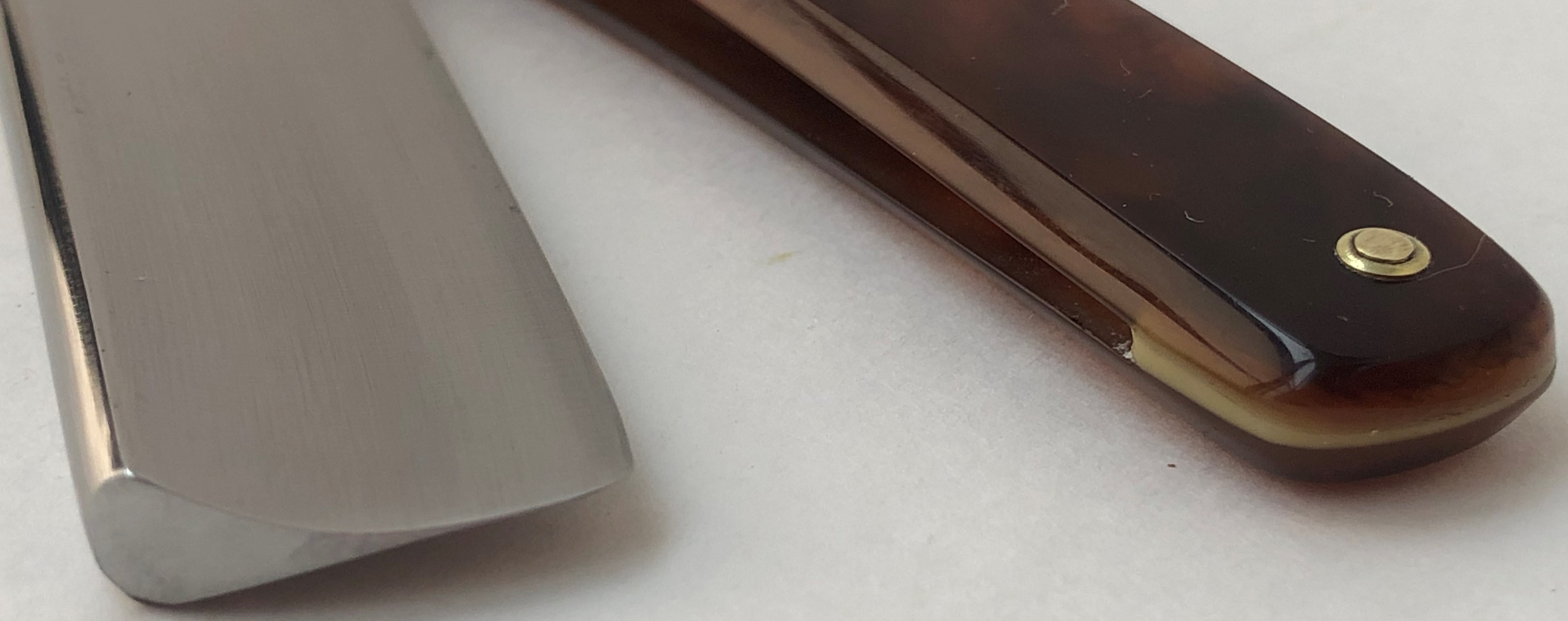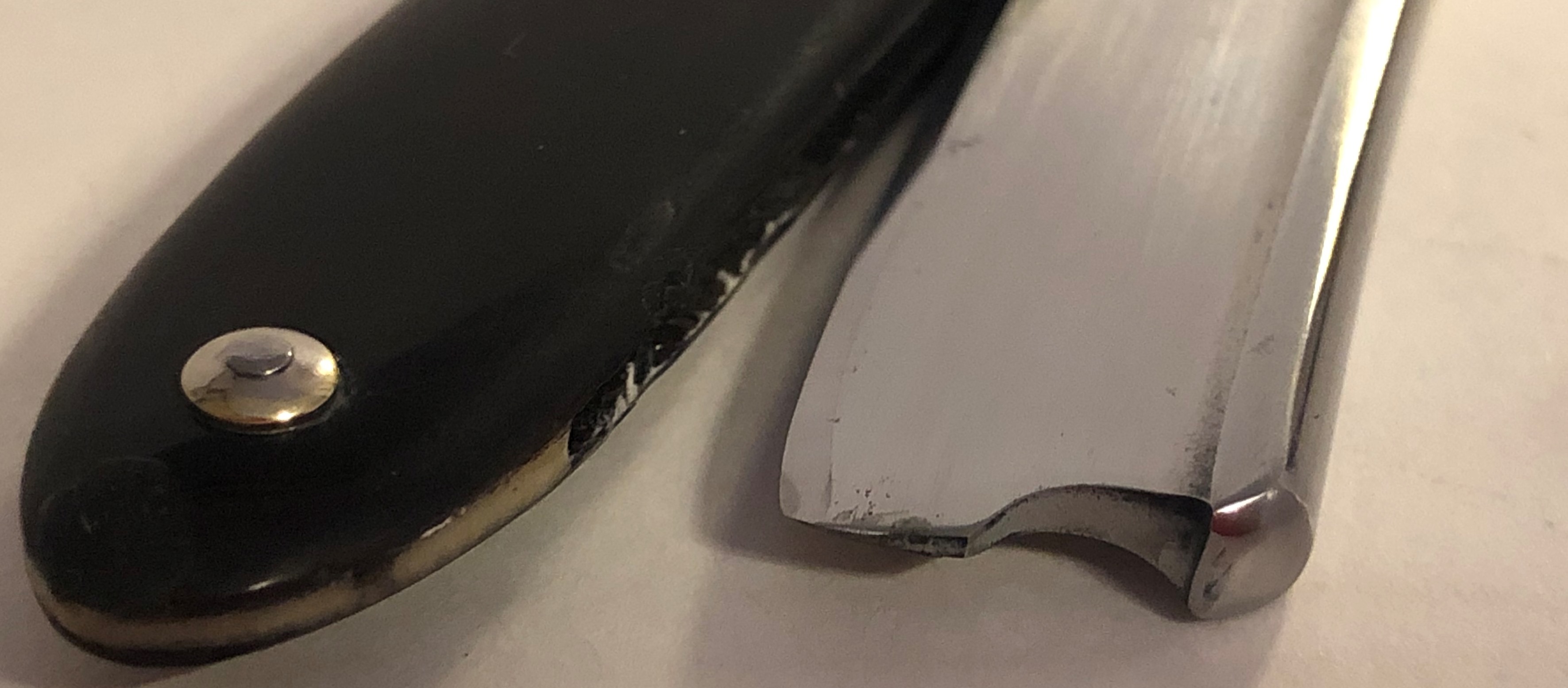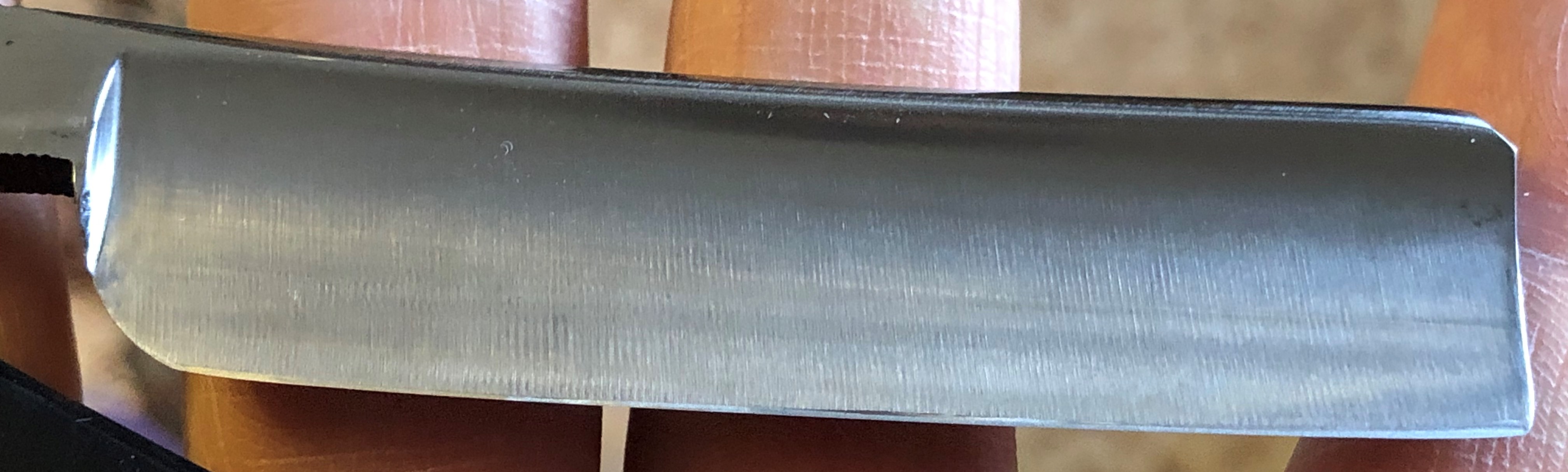 Бритва непользованная, но была разобрана,для удаления окисления в районе осевого пина.Также, прошелся самыми тонкими абразивами по полотну,что позволило восстановить былую свежесть и блеск.Идеальная геометрия клинка:кромочка равномерна по всей длине и практически незаметна.Состояние новой бритвы.Сталь и кромочка чистые от дефектов.Потихоньку тестируя такую же заточенную уже бритву прихожу к выводу, что сталь имеет среднюю твердость и в бритье чем то напоминает англичан начала прошлого века.Бритьё мягкое и чистое, без заметной агрессии. На мой взгляд, подобная форма лезвия и удачный выбор стали и закалки делает инструмент просто незаменимым на все случаи жизни и держа такую бритву, просто не хочется выпускать из рук. Все четко,идеально и без излишеств. Перед отправкой будет заточена и доведена до комфортного бритья.